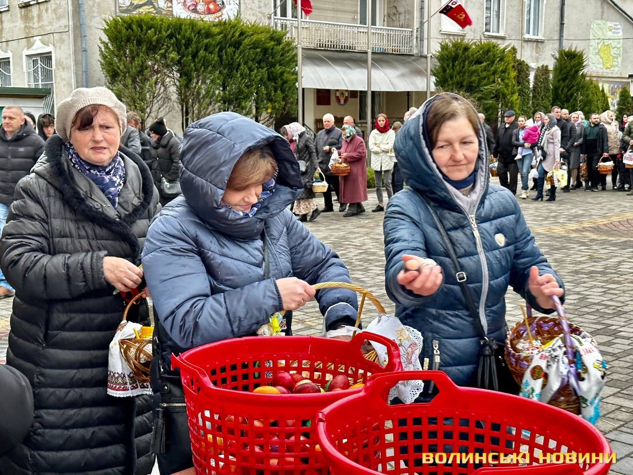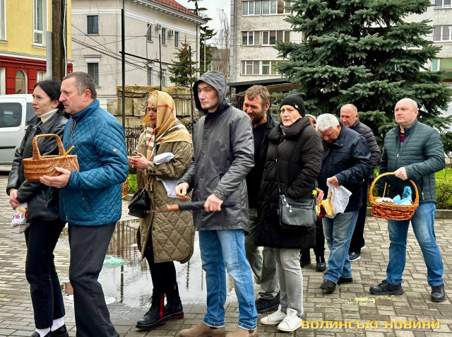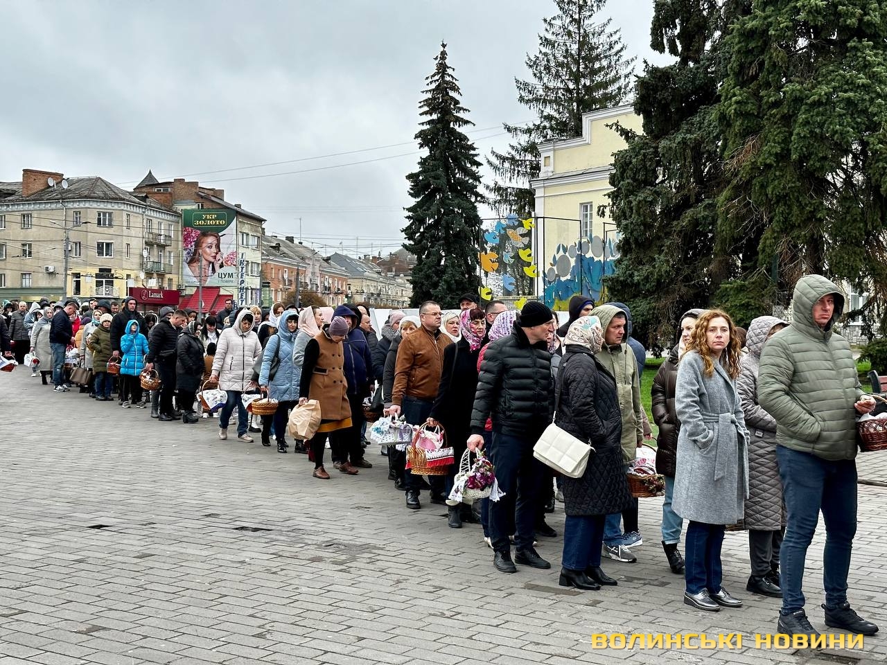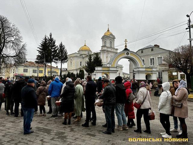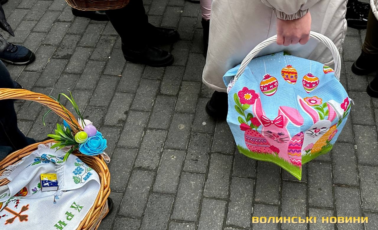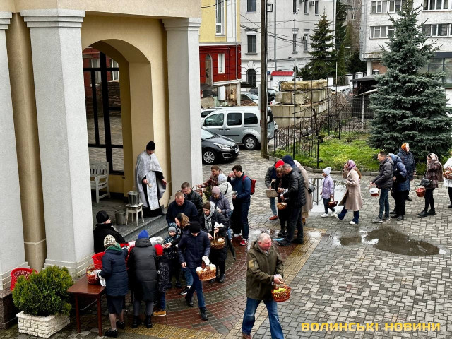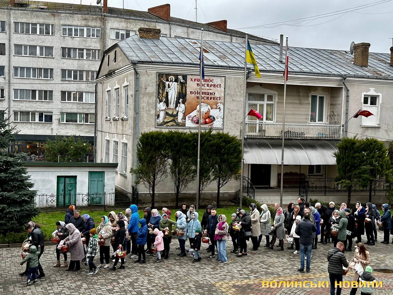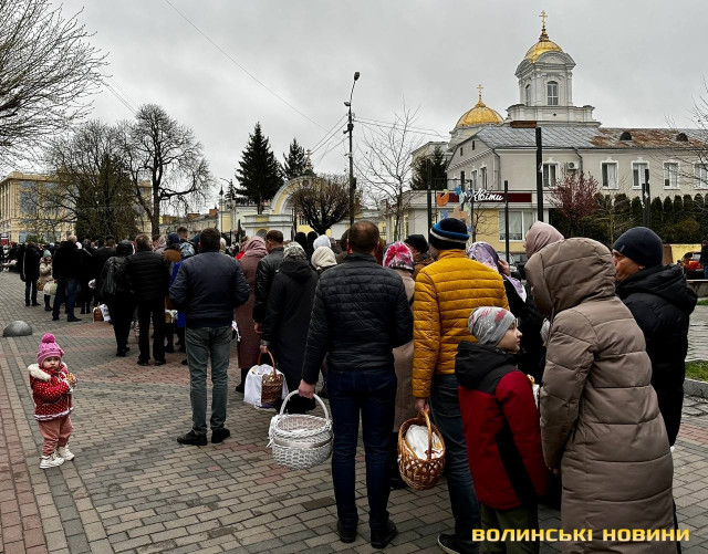Оскільки через війну з росією на Волині діє комендантська година, лучани прийшли освятити великодні кошики вдень, хоча у попередні роки багато з них приходили до храмів вночі.