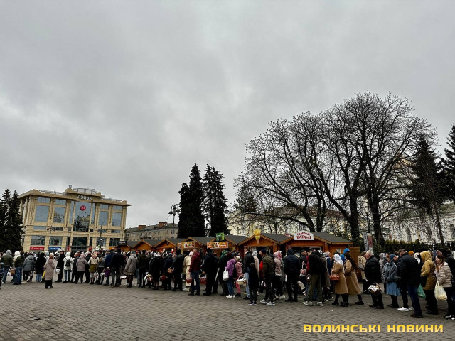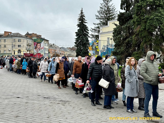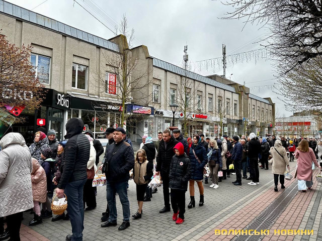 У центрі Луцька – кілометрова черга з охочих освятити великодні кошики. Фото