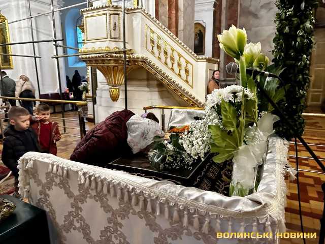 Після освячення кошиків охочі віряни заходять усередину собору, аби преклонитися перед плащаницею та запалити свічки.Освячення пасхальних страв у соборі триватиме до 21:00.