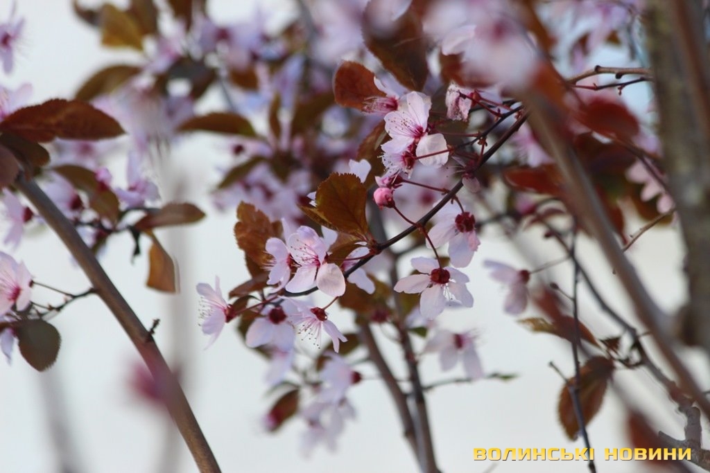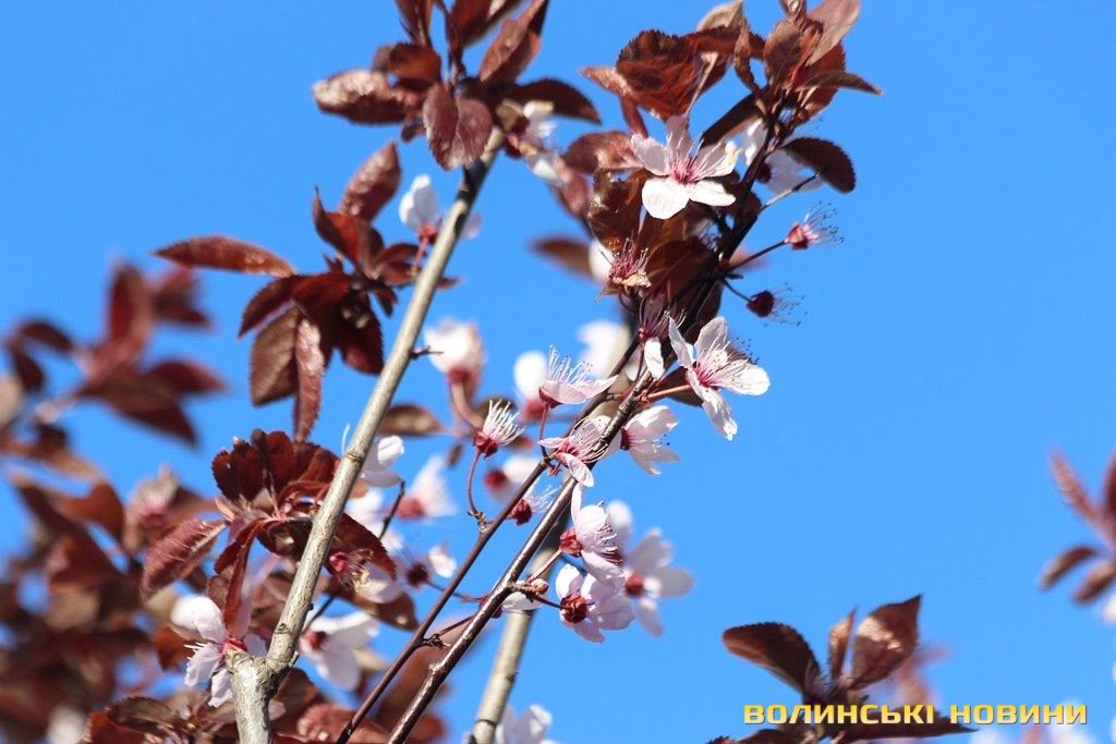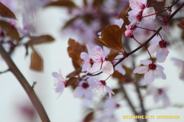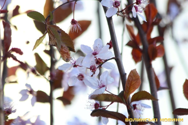 У одному із скверів, що знаходиться у центрі Луцька, квітують декоративні іранські сливи «Піссарді», або іранська червонолиста алича.