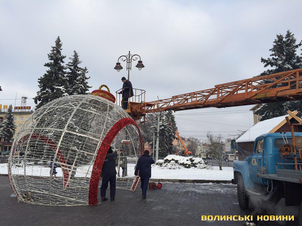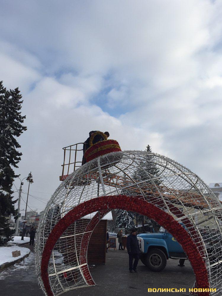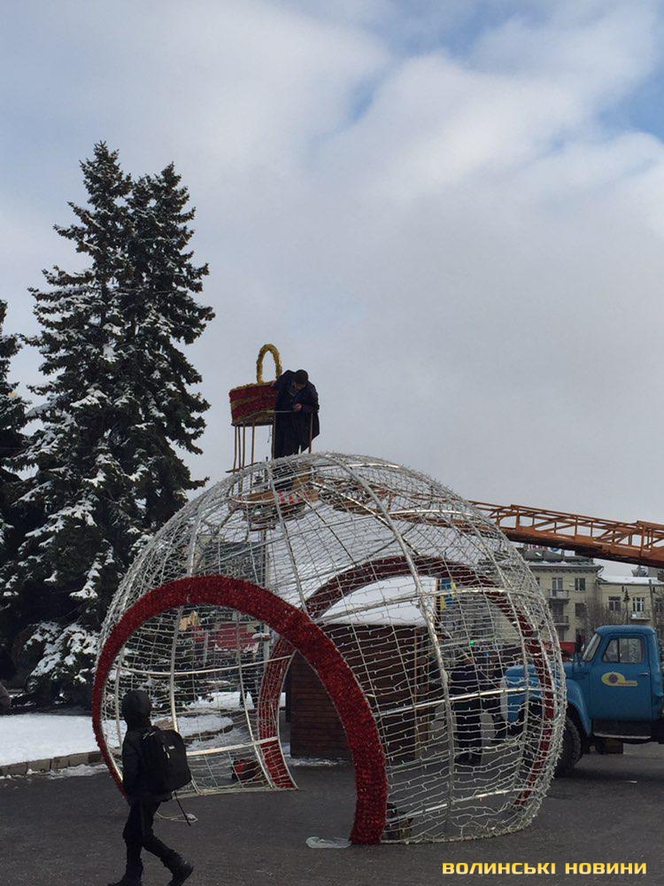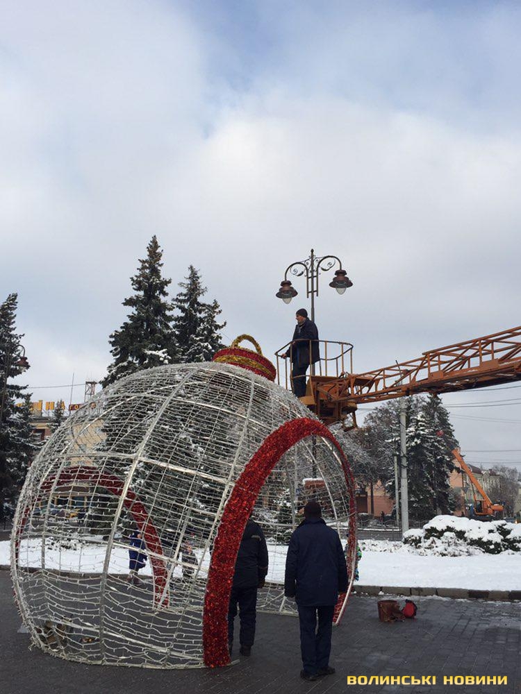 На Театральному майдані у центрі Луцька монтують новорічну інсталяцію - велику ялинкову кулю.