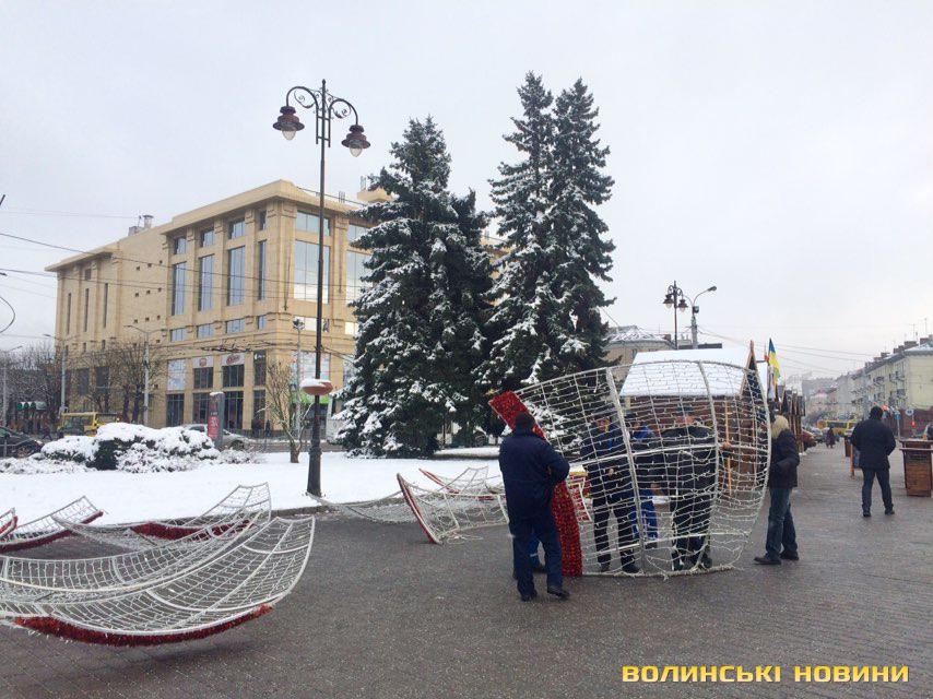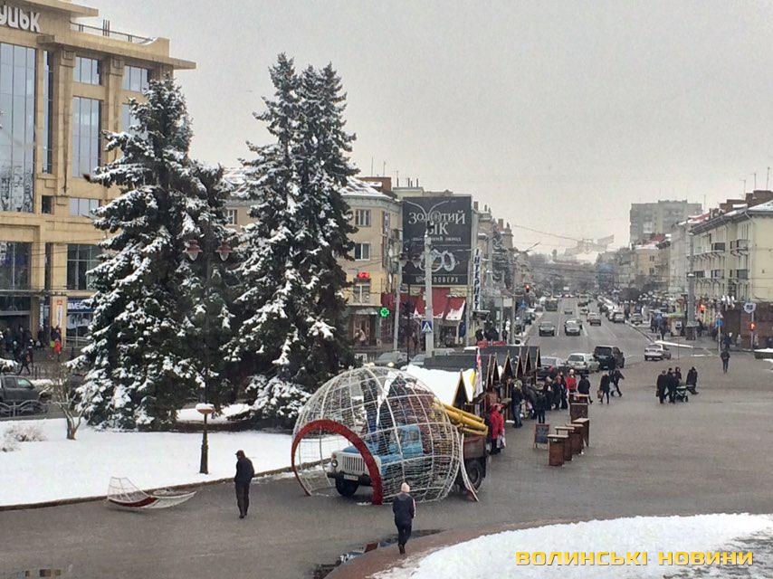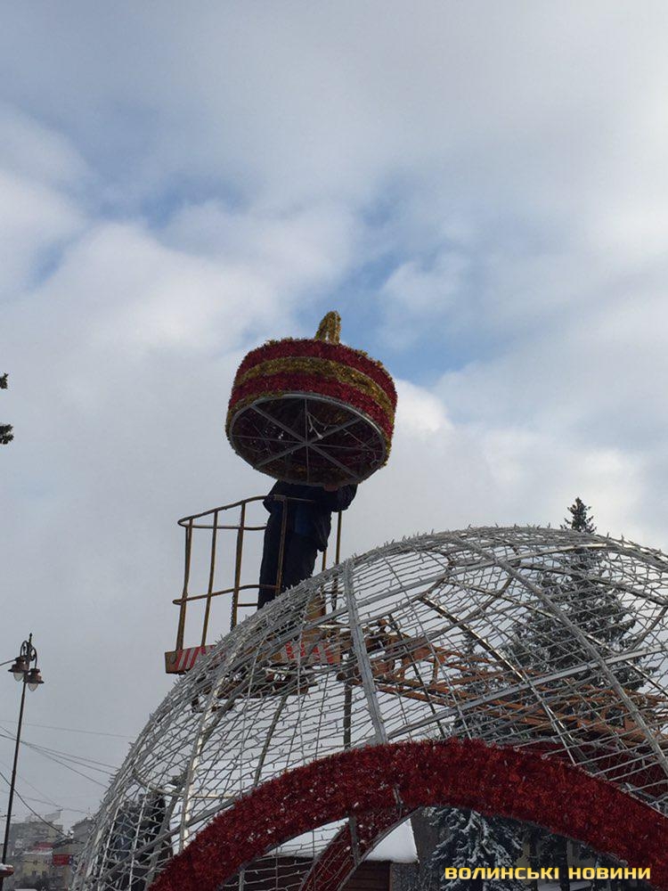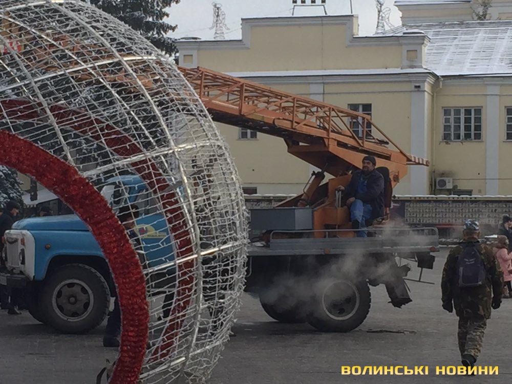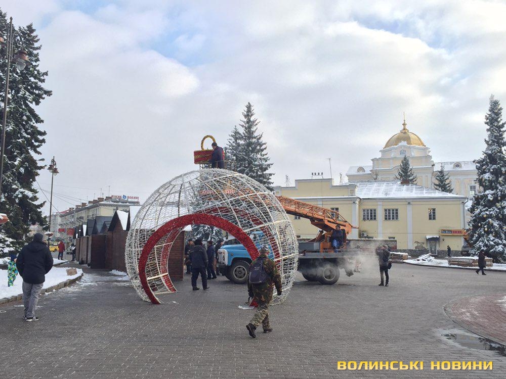 На Театральному майдані у центрі Луцька монтують новорічну інсталяцію - велику ялинкову кулю.