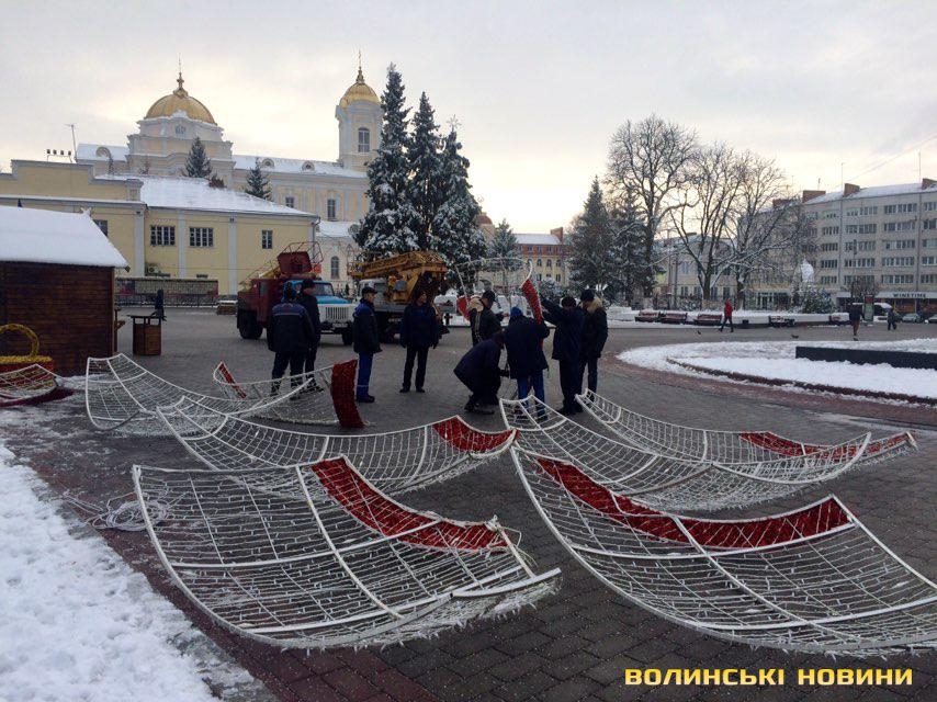 Наразі збирають металеву конструкцію, яка незабаром засвітиться вогнями, доповнюючи святкове офомлення трьох новорічних красунь.