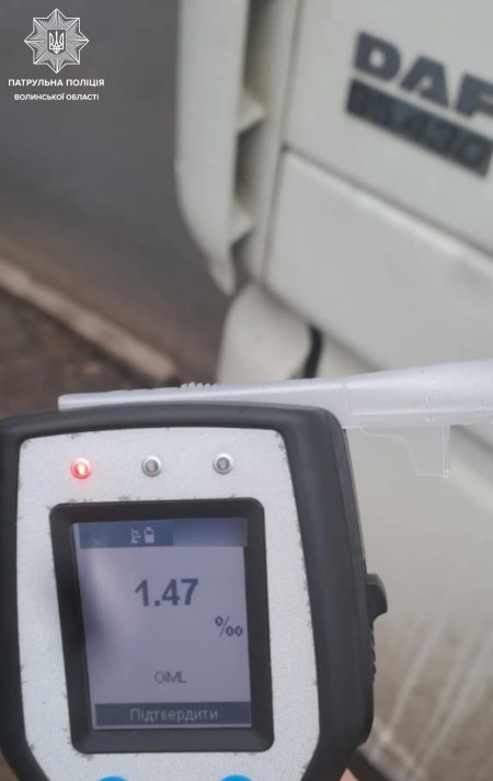 Під час спілкування інспектори помітили у нього ознаки алкогольного сп’яніння. Водій пройшов огляд на місці. Результат – 1,47 проміле.