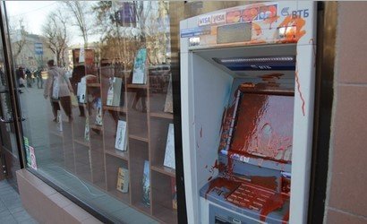 У центрі Луцька невідомий облив червоною фарбою банкомати двох банків