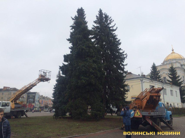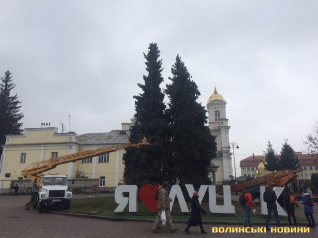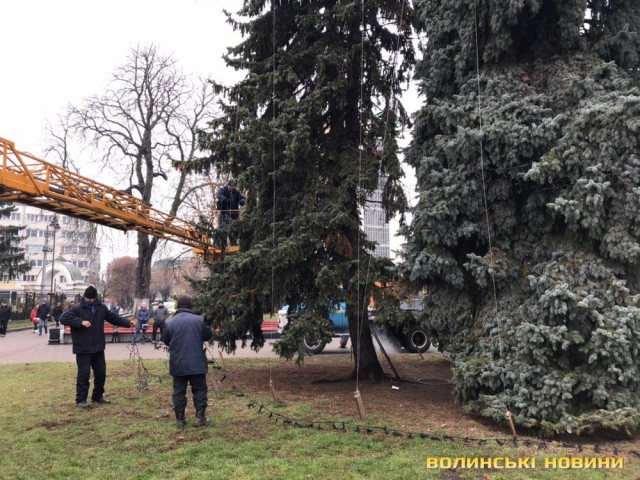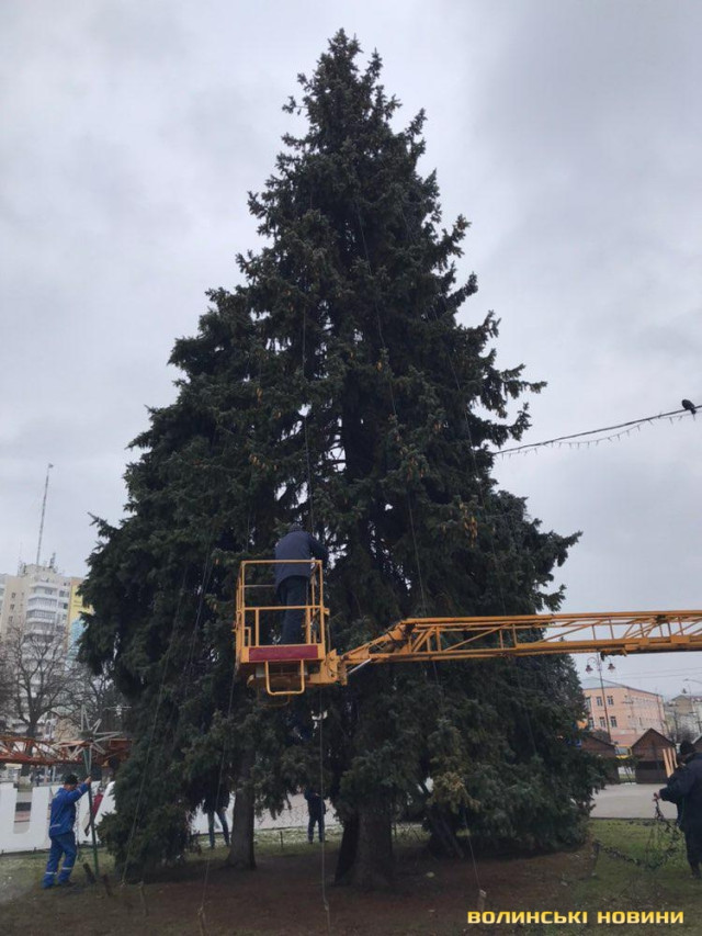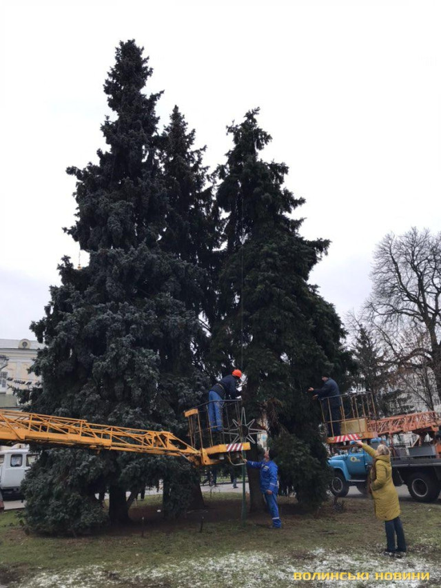 У центрі Луцька прикрашають головне ялинкове тріо. Фото