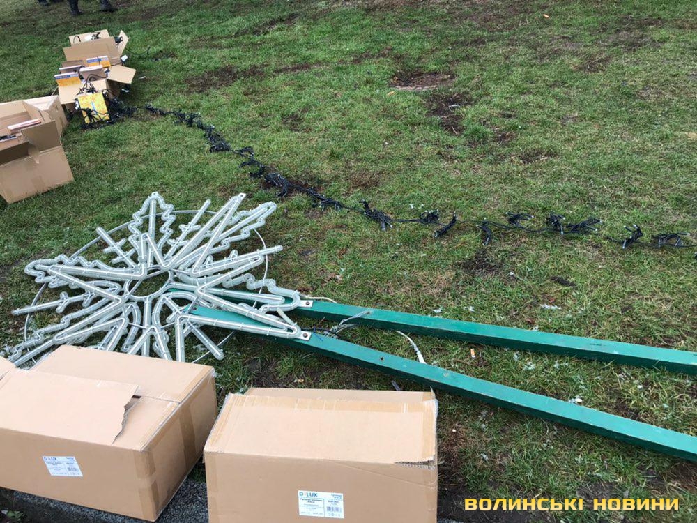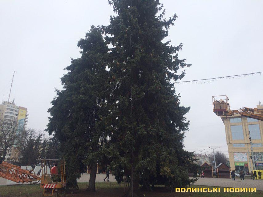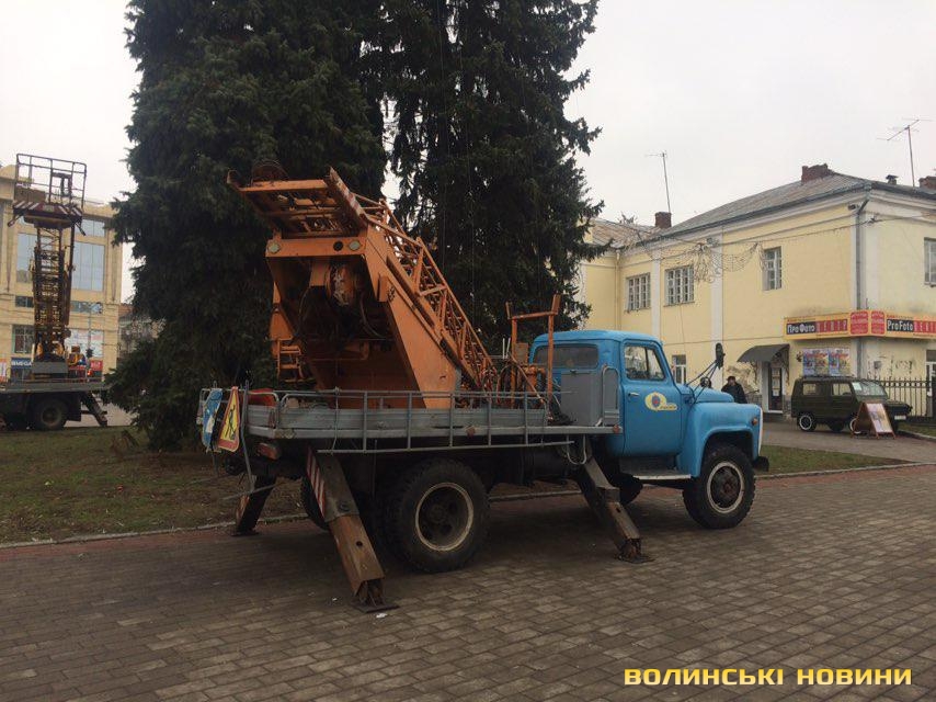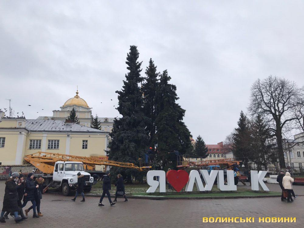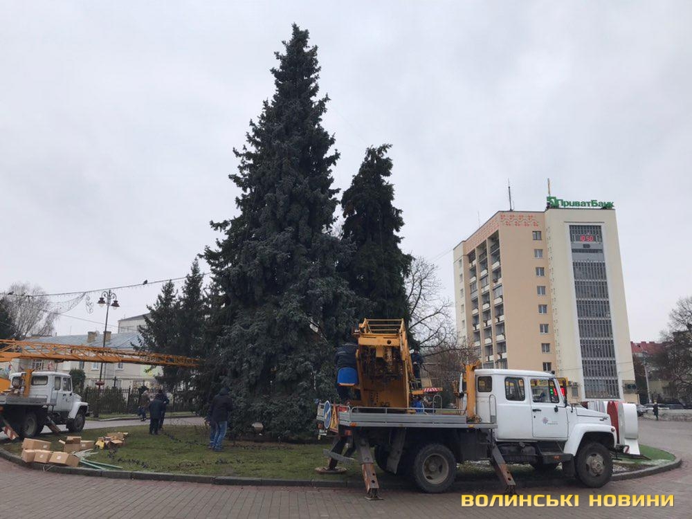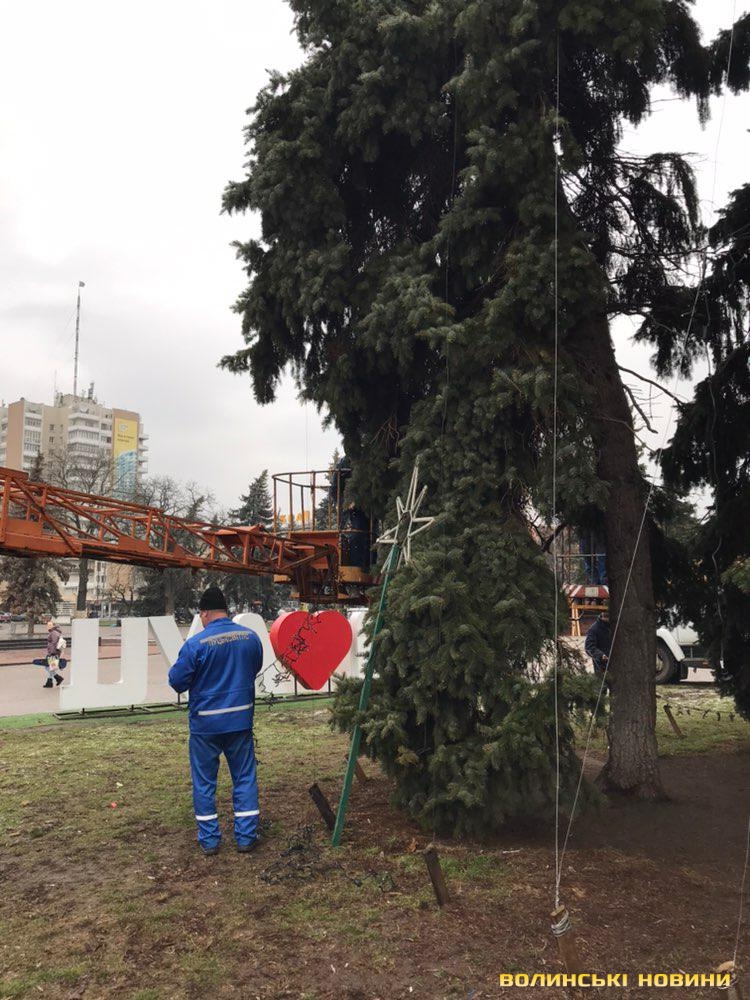 У центрі Луцька прикрашають головне ялинкове тріо. Фото