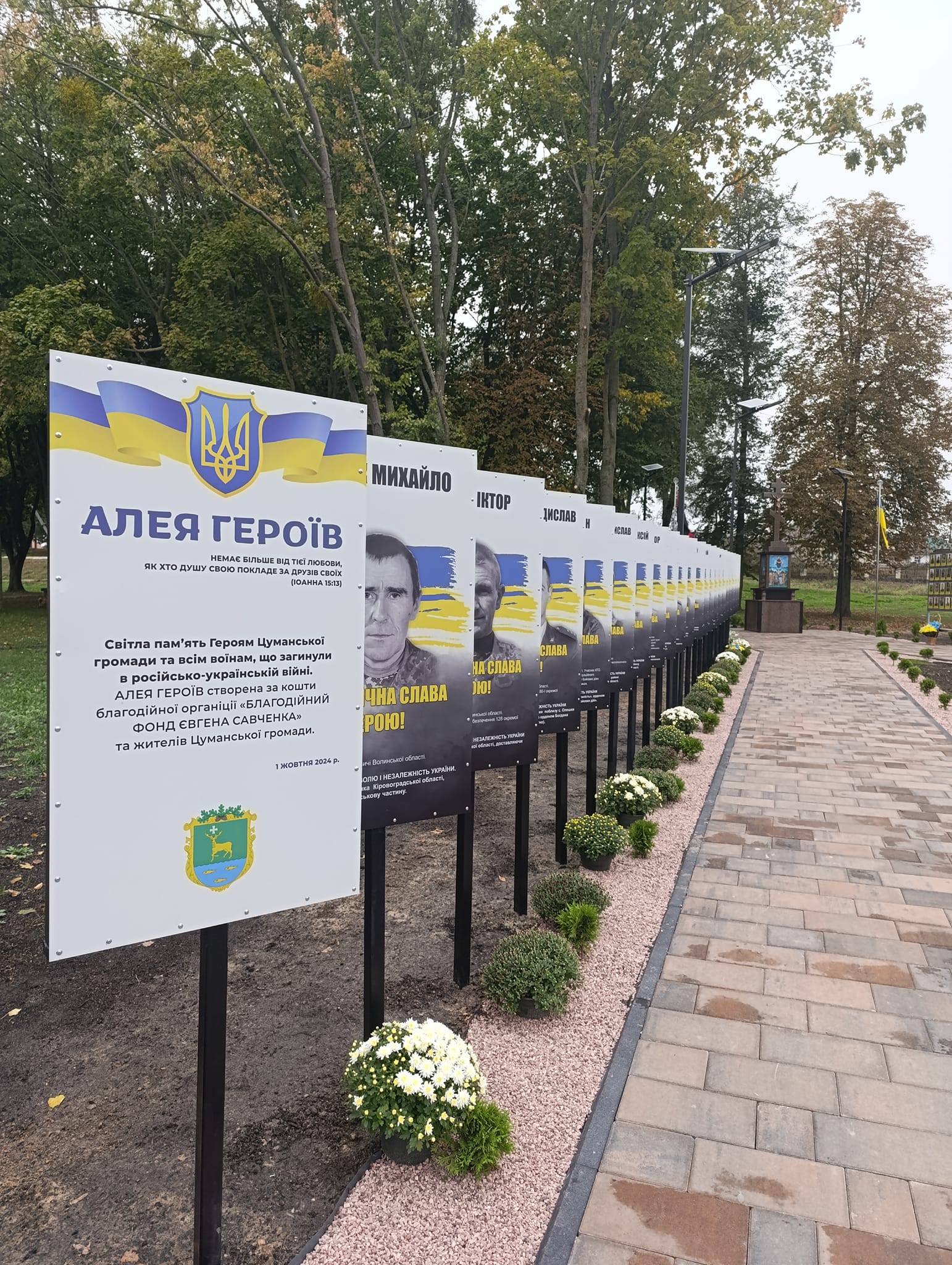 Місце скорботи і шани з портретами 40 мешканців громади, загиблих під час російсько-української війни, освятили у День захисників і захисниць та свята Покрови Пресвятої Богородиці у Цумані.