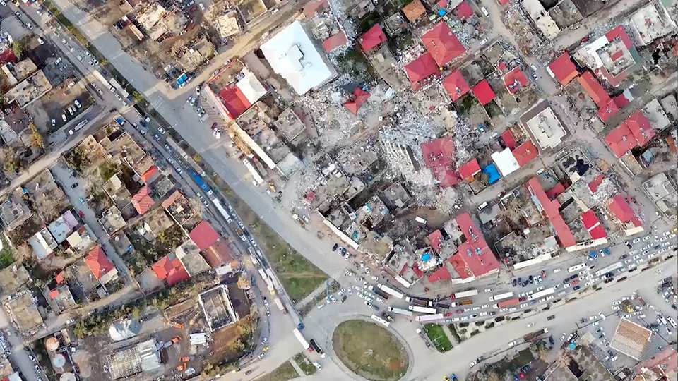 Телеканал показав кадри, на яких зверху знято масштаби руйнувань та кадри до землетрусу для порівняння.За даними департаменту з питань землетрусів та зменшення ризиків (AFAD), у районі нових землетрусів працюють БПЛА Bayraktar TB2, які задіюють для огляду пошкоджених і зруйнованих будинків.