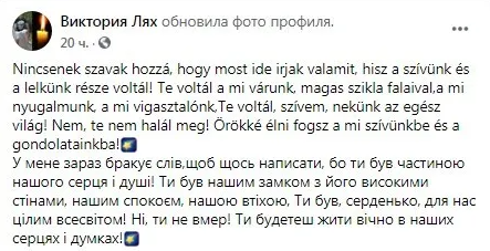 «У мене зараз не вистачає слів, щоб щось написати, ти був частиною нашого серця і душі, ти був замком з його високими стінами, нашим спокоєм, нашою радістю, ти, милий, для нас був цілим всесвітом! Ні, ти не помер, ти будеш жити вічно в наших серцях і думках», – написала вона.