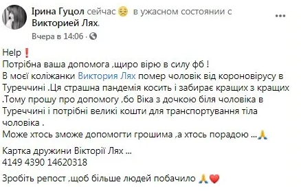 «У моєї подруги Вікторії Лях помер чоловік від коронавірусу в Туреччині. Ця страшна пандемія косить і забирає кращих з кращих», – написала вона у фейсбуці.
