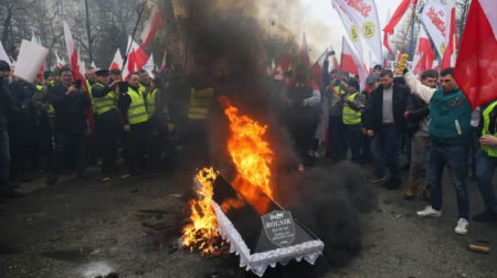 За повідомленнями журналістів Polsat News, фермери несуть антиукраїнські плакати."Ми тут, щоб розповісти прем'єр-міністру про те, що нам болить, про що він повинен знати. Зелений курс, все, що з ним пов'язано, і захист польських кордонів від напливу неконтрольованих продуктів з України, Росії та Білорусі. Це те, що нам болить… Цей зелений курс – це кінець для нас усіх. Якщо уряд не захистить нас, ми пропадемо. Польща зникне. Ми всі об'єднані разом. В єдності – сила, ми не дозволимо розділити фермерів", – сказав один з лідерів протесту під час свого виступу.
