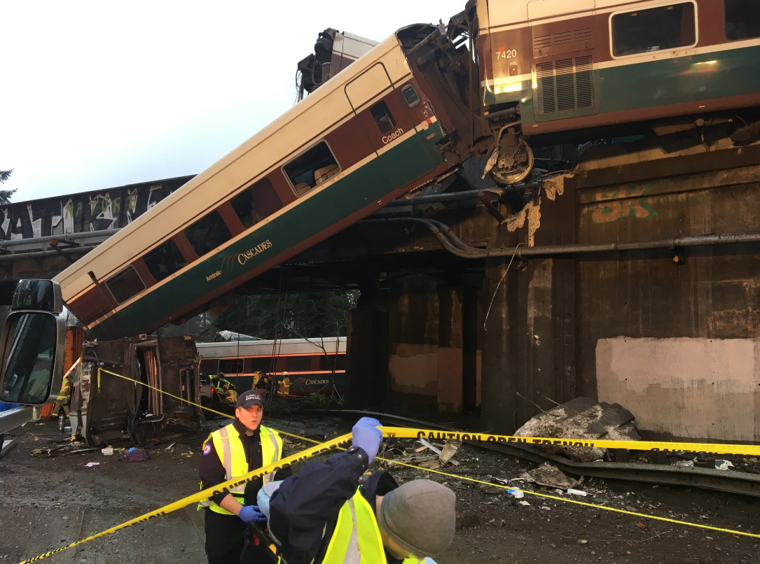 #BreakingNews high speed @Amtrak train hanging over I-5 at Mounts road. First responders treating this as a mass casualty incident. No official word on injuries yet. @KIRO7Seattle pic.twitter.com/bSXstBQNdJ