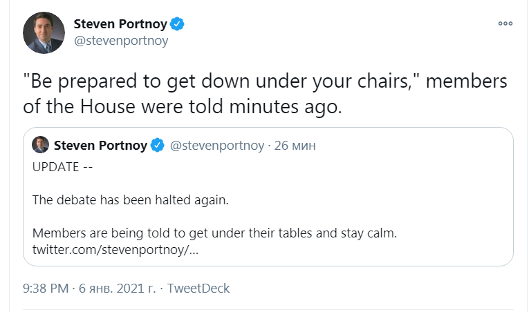 «Учасників (обговорення сертифікації виборів, - ред.) просять залізти під столи і зберігати спокій. «Будьте готові лягти під свої крісла», - сказали членам палати кілька хвилин тому», - описав ситуацію в Конгресі журналіст.Спікер Палати представників Ненсі Пелосі вимагає від Нацгвардії захистити Конгрес. Але в ЗМІ надійшла інформація, що Пентагон відхилив запит на те, аби відправити Нацгвардію до Капітолію.