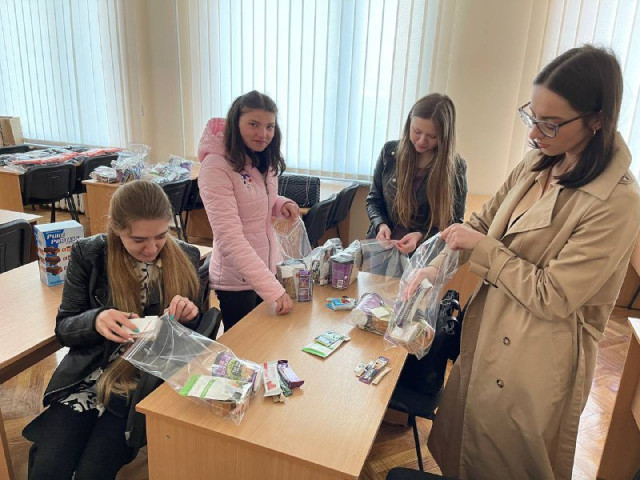 На базі одного з факультетів Університету волонтери формують сухпайки, які згодом отримають захисники та захисниці України. Разом зі студентами-волонтерами формує продуктові набори і доцент кафедри історії та культури української мови Ірина Левчук.