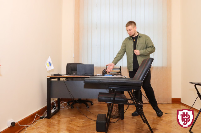 За його словами, лабораторія повністю відповідає нормам поліграфічного кабінету. Вадим Грачук розповів присутнім про облаштування лабораторії та те, як працює поліграф і спеціаліст-поліграфолог. Після цього учасникам презентації продемонстрували роботу поліграфа «Рубікон».