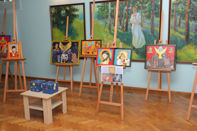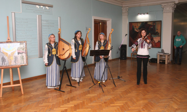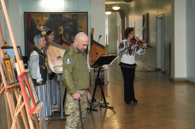 Виставка робіт Руслана Кашаюка благодійна: картини можна придбати, а зібрані кошти підуть на потреби ЗСУ. Тріо бандуристок «Дивоструни» (керівниця Мирослава Сточанська) супроводжувало дійство тематичними композиціями.