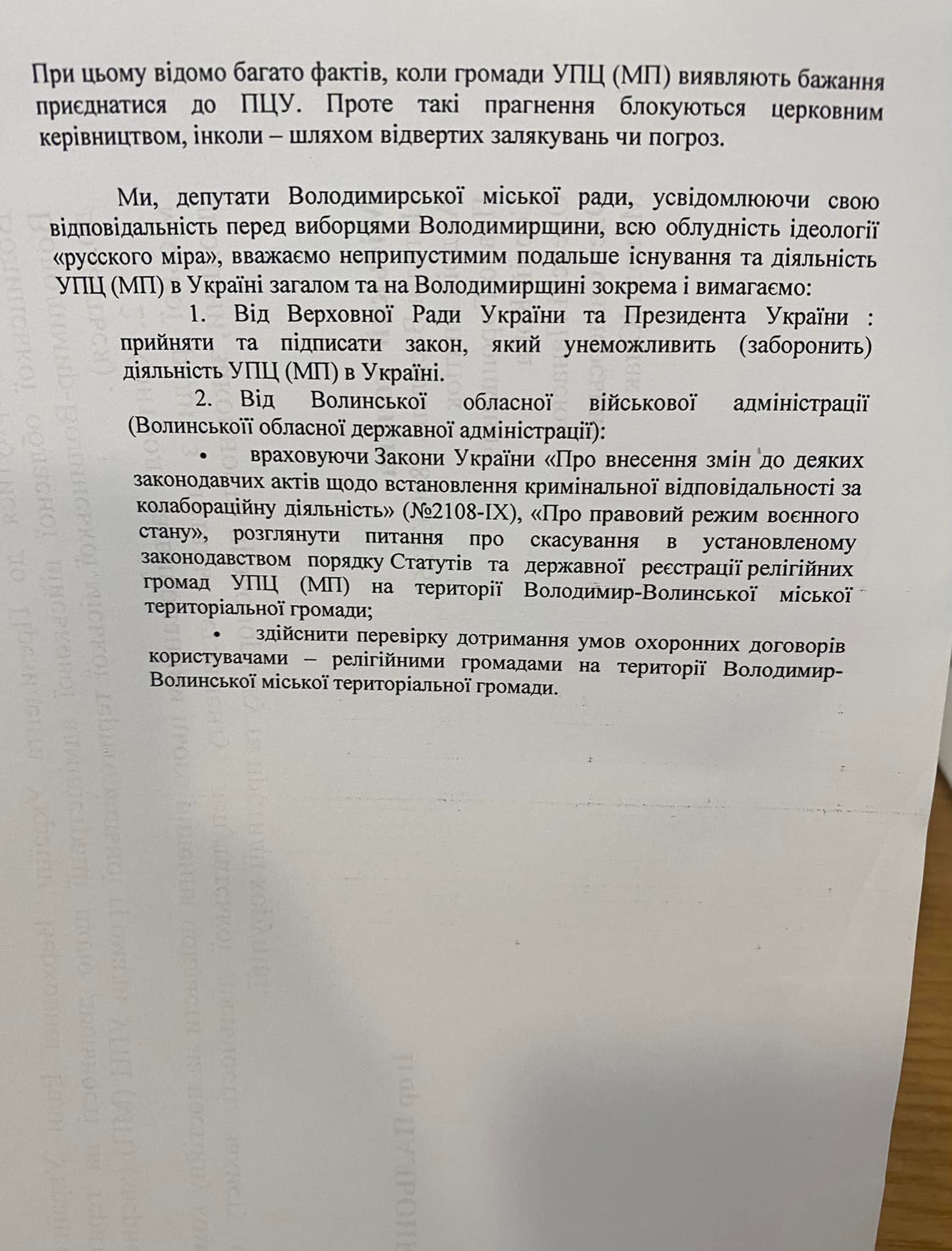 Очільники депутатських фракцій міської ради Володимира вважають неприпустимою подальше існування на території громади УПЦ МП і звернулися до Президента України, Верховної Ради та Волинської ОВА з вимогою про припинення діяльності УПЦ МП на території громади.