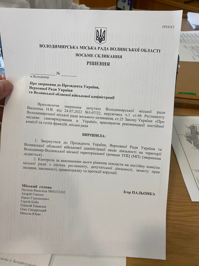 Звернення, яке зачитав міський голова, підписали: Ігор Пальонка, Андрій Гнатюк, Наталія Василець, Павло Горошкевич, Сергій Коба, Олексій Панасюк, Олег Свідерський, Микола Юнак.