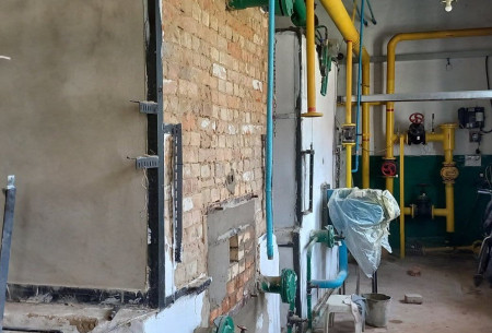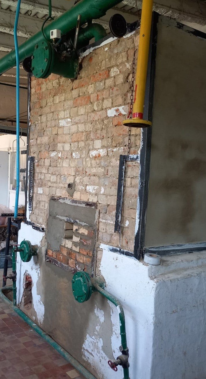 Наразі будівельники відновлюють обшивку котлів, обкладаючи їх вогнетривкою цеглою. Це робиться задля того, щоб забезпечити герметичність котла та вберегти від витоків газів згоряння і природного газу.