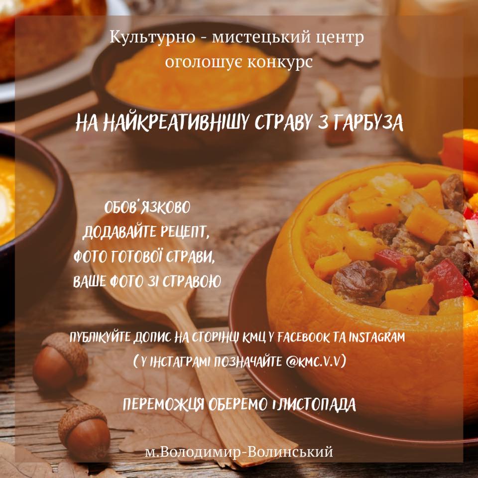 «Осінь називають найбільш щедрою порою року. І не дивно, адже це час збору врожаю овочів, фруктів та зернових. І саме на завершення осіннього сезону «ходить гарбуз по городу». З цього чудо-овоча можна приготувати різноманітні страви, які прикрасять стіл з будь-якої нагоди. Цього року з нагоди завершення сезону врожаю культурно-мистецький центр оголошує конкурс «На найкреативнішу подачу страви з гарбуза»», – йдеться на сторінці КМЦ у Фейсбуці.