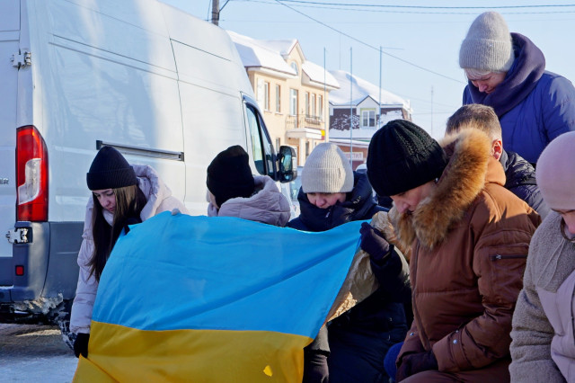 Траурний кортеж, який проїжджав вулицями міста, мешканці громади зустріли стоячи навколішки із синьо-жовтими стягами у руках, повідомляє Володимирська міська рада.