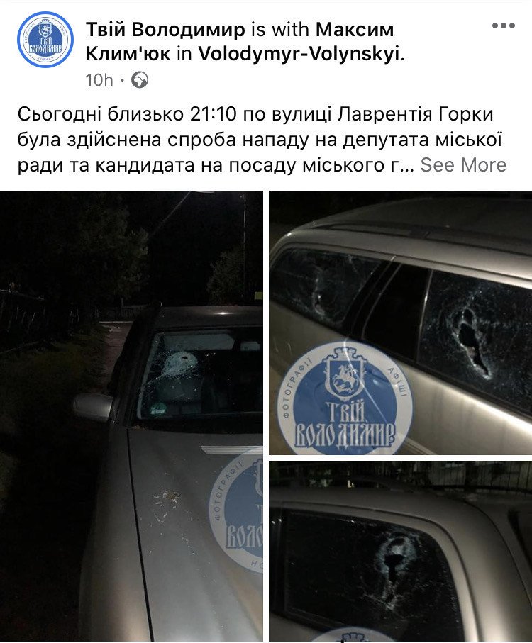 У місті Володимир-Волинський Волинської області увечері 10 вересня невідомі особи напали на автомобіль депутата і потенційного кандидата на посаду міського голови Максима Клим’юка, коли він перебував усередині. Він звернувся в поліцію та наразі роздумує, чи буде тепер брати участь у передвиборній гонці.
