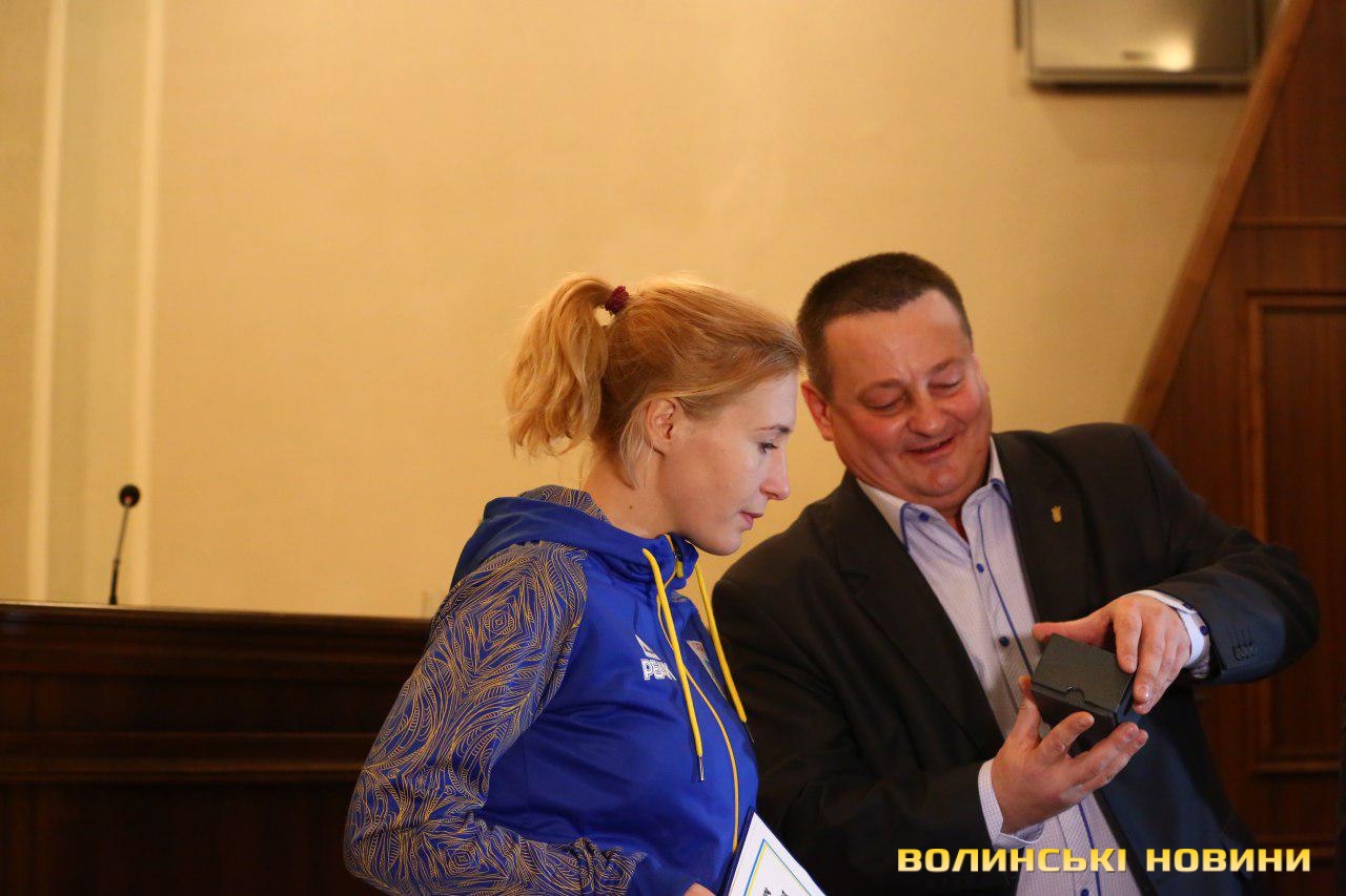 Ветеран війни з Росією, старший лейтенант поліції, призерка Ігор нескорених, член національної збірної України Майя Москвич отримала почесну грамоту Волинської обласної ради та цінний подарунок – годинник.