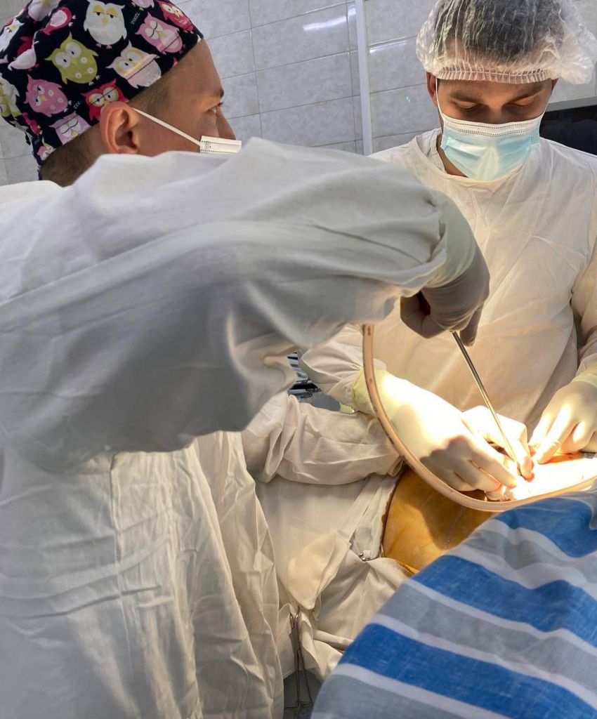 Пацієнту діагностували емпієму плеври справа та провели оперативне втручання. В операційній працювали хірурги Євгеній Тарасенко та Іван Пасічник.