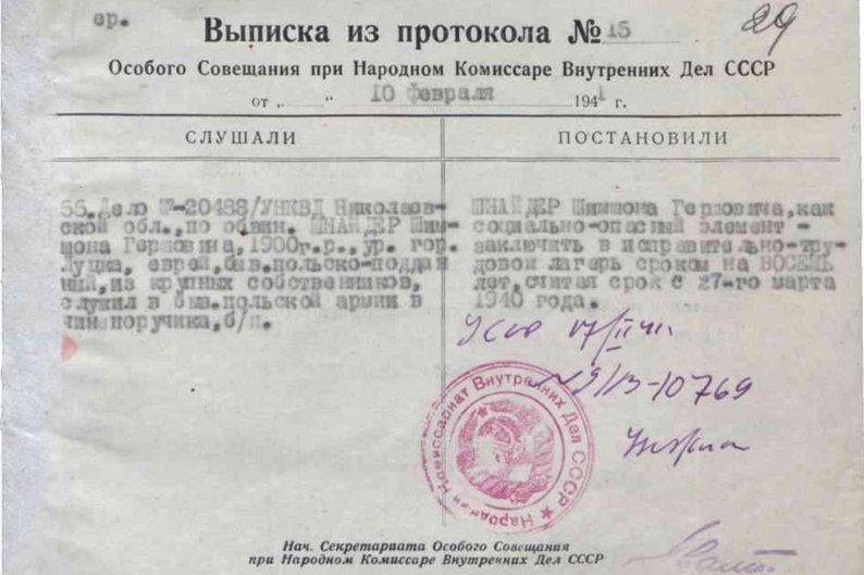 «Спеціальне засідання при Народному Комісаріаті Внутрішніх справ СССР» ухвалило таке: «Шнайдера Шимшона Гершовича як соціально-небезпечного елемента заключити у виправний трудовий табір на вісім років». Подальша доля чоловіка невідома.