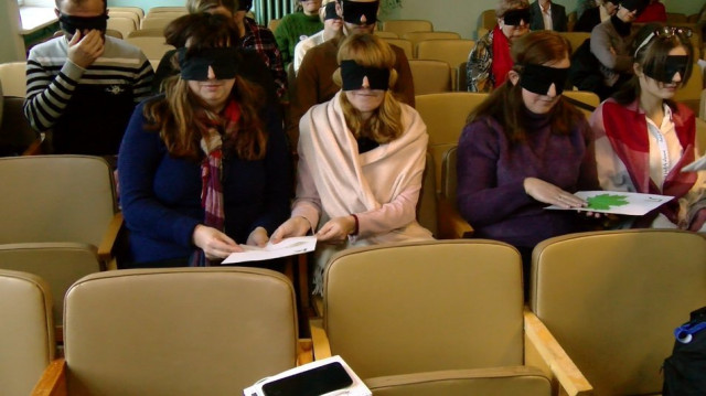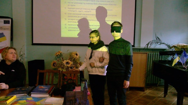 Учасникам тренінгу зав’язали очі, вони могли відчути на дотик 3D-макети пам’яток монументального мистецтва.«На практиці це, на собі спробувати, відчути себе в ролі цих людей, набагато важливіше, дуже добре дає розуміння, як цим людям насправді», – розповів студент Іван Дейнека.