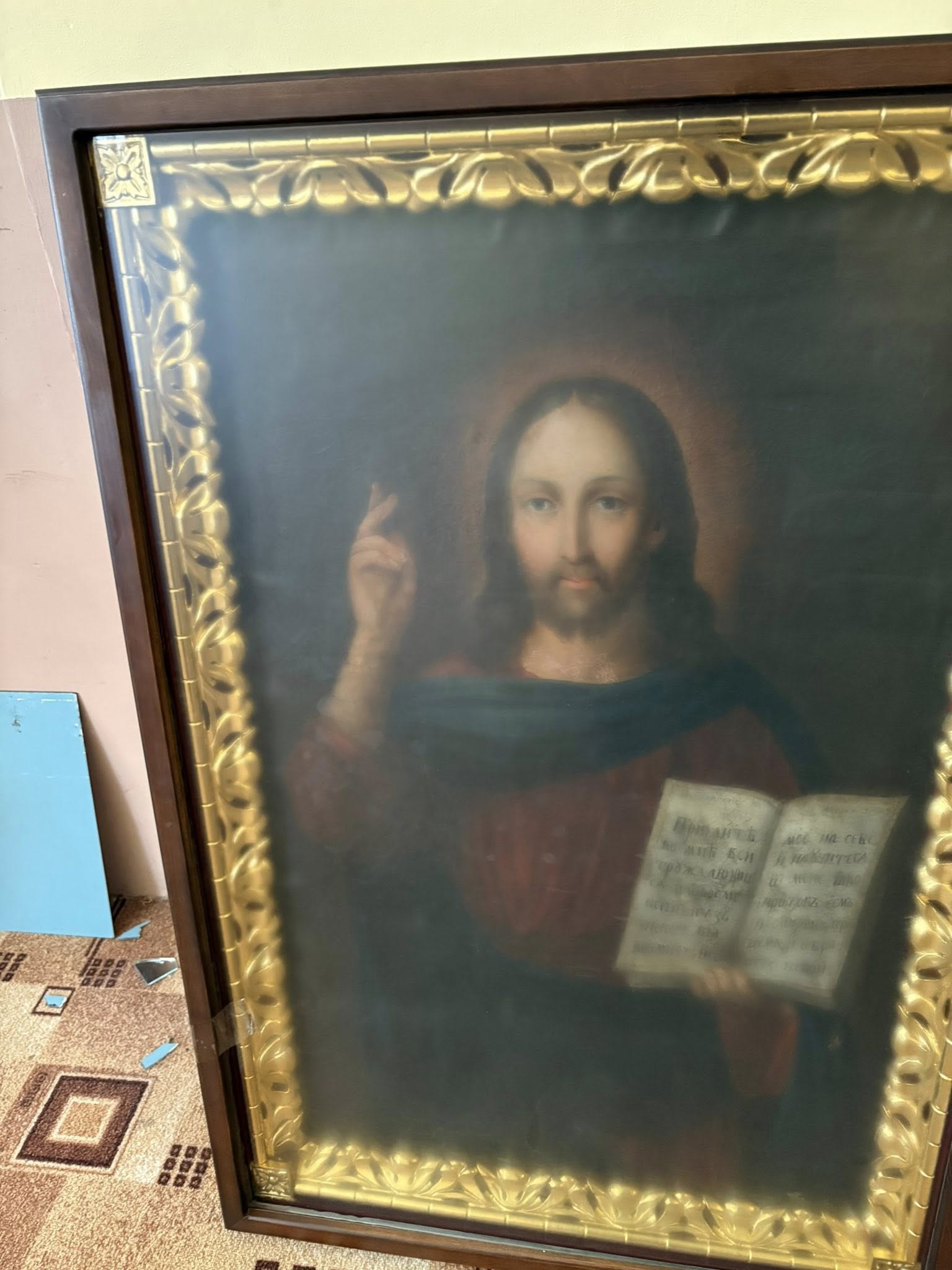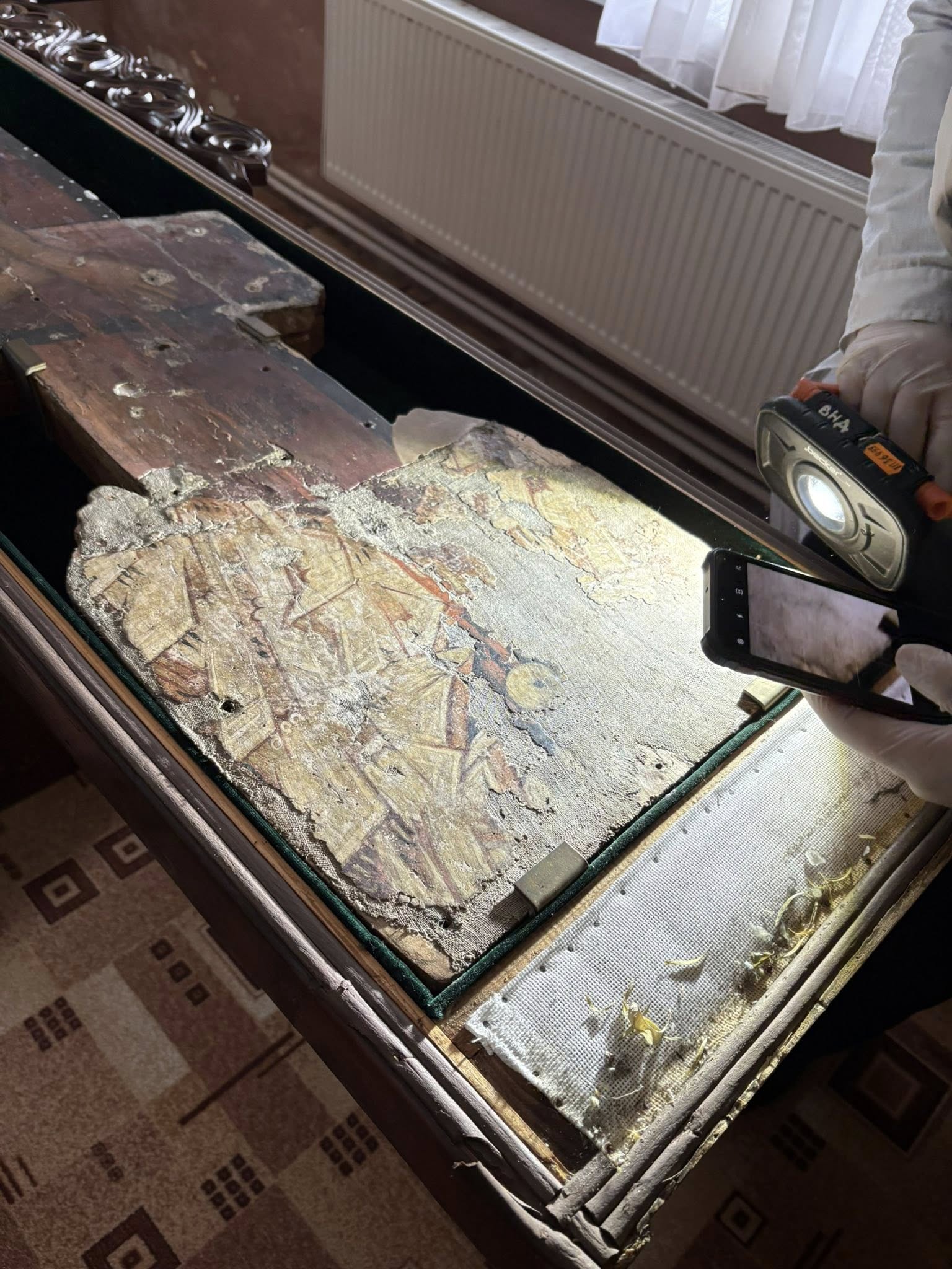 Після обстеження і фотофіксації фахівці здійснили дезінфекцію, адже фарбовий шар був уражений спорами грибів. Також укріпили левкас і шар фарби, де вона полущилась.
