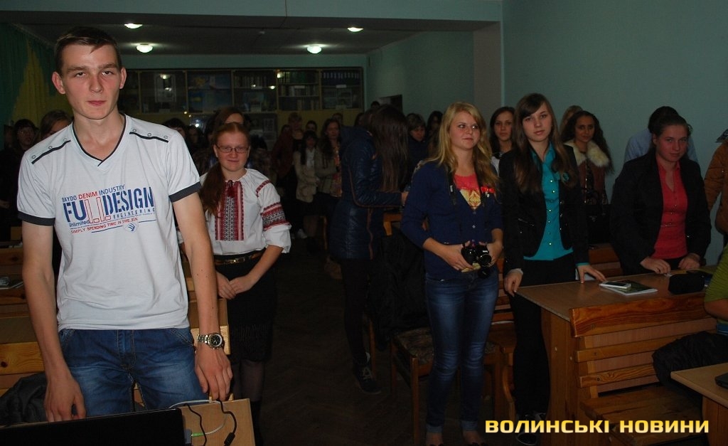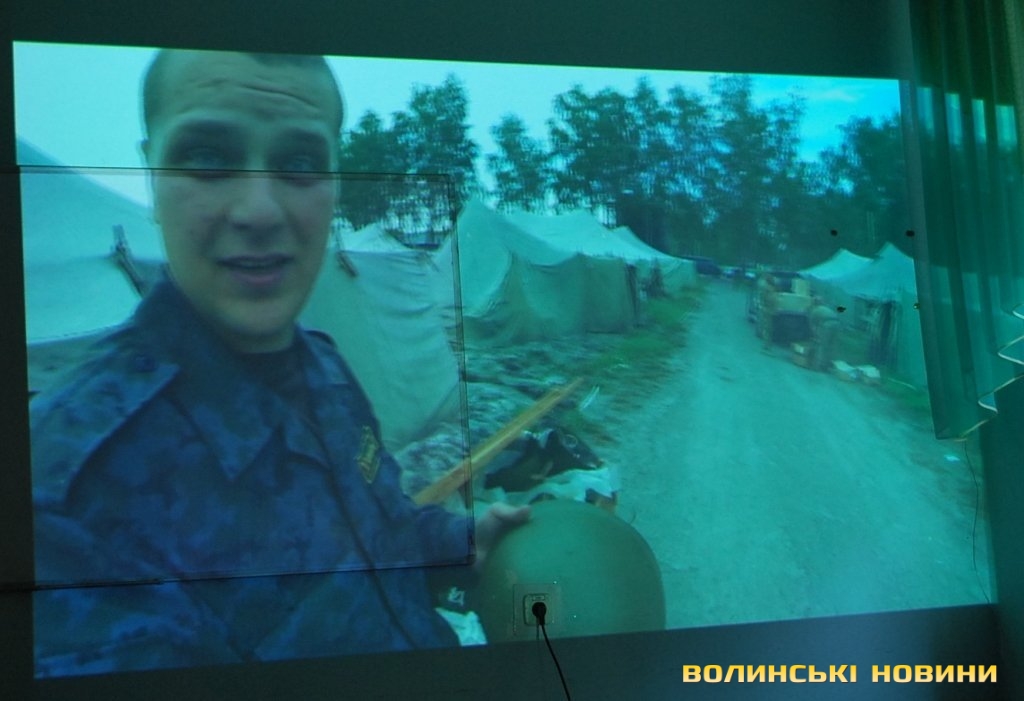 Перед початком спілкування студентів з Максимом Лящуком присутнім продемонстрували документальний фільм, який ще не показували по телебаченню. «Це відео не те, що показують зазвичай по телевізору, тут «живі кадри», події, які розгорталися на очах українського бійця, воно допомагає краще осягнути усі масштаби цієї війни. Зауважу, що, лише згідно з офіційною статистикою, на цій війні загинуло 72 волинянина», - звернувся до студентів викладач ЛПК та керівник суспільно-політичного клубу «Всесвіт» Анатолій Кравець, який і організував цю зустріч.У продемонстрованому відео журналіст, який пішов воювати на Схід України, показує власний пережитий досвід, починаючи з дня, коли він прийшов добровольцем в Нацгвардію, до реальних боїв.