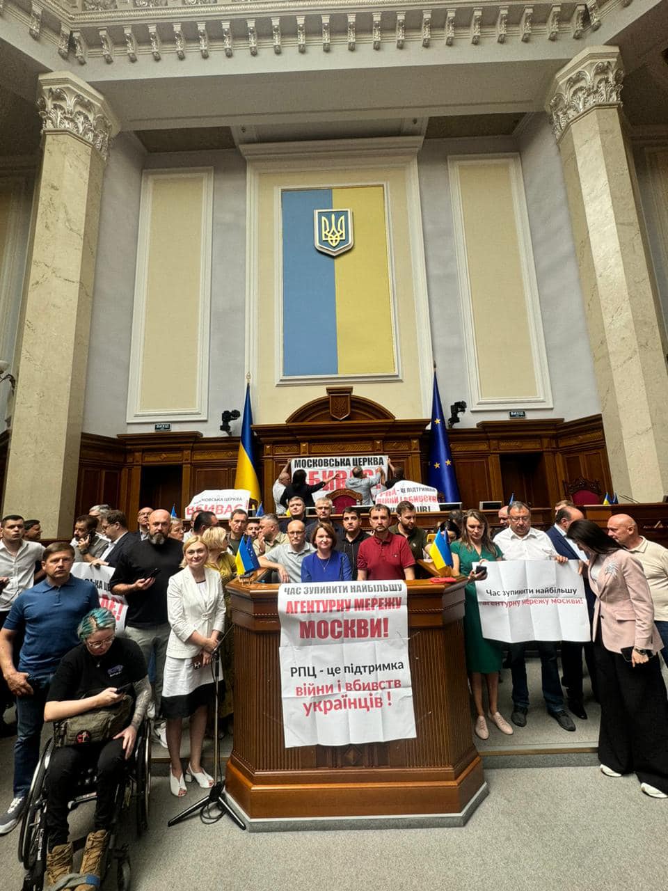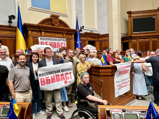 У вівторок, 23 липня, кілька десятків народних депутатів заблокували трибуну у Верховній Раді. Вимога – поставити на розгляд законопроєкт про заборону релігійних організацій, який фактично унеможливить діяльність УПЦ МП в Україні.