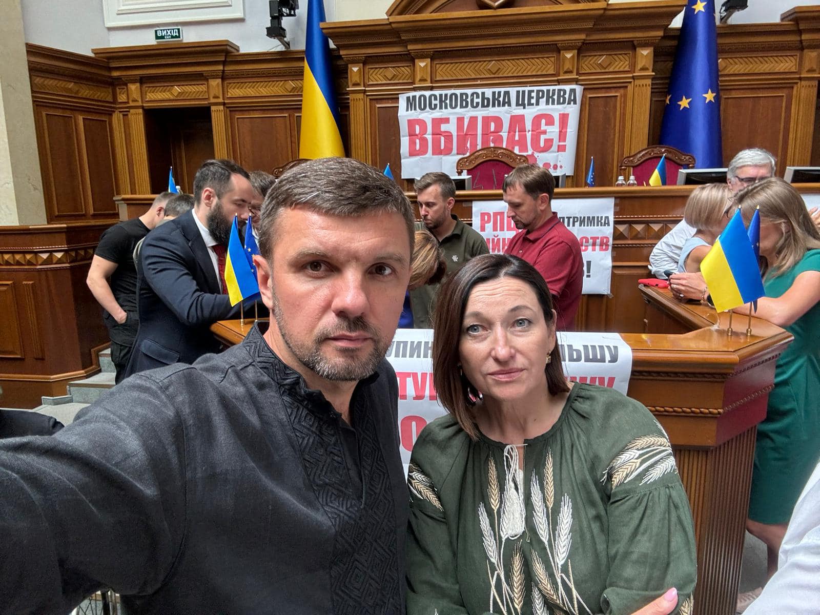 Поміж блокувальників – волинські нардепи Ігор Гузь, Ірина Констанкевич."Разом з колегами блокуємо трибуну Верховної Ради! Вимагаємо голосування і прийняття закону #8371 про заборону московської церкви! Не дивлячись на таку вимогу, засідання фактично перенесли аж на серпень! Уявляєте? Все зробили, аби залишити руку москви в храмах і головах прихожан. Це не рішення! Чекати ми вже не маємо права! Вимагаємо провести голосування і підтримати заборону московської церкви в Україні!