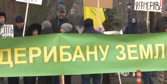 Майже 50 мітингувальників тримають різні плакати, зокрема «Ні – дерибану землі!»Протестувальники вимагають референдум, а також створити банк землі, щоб держава могла нею розпоряджатися.