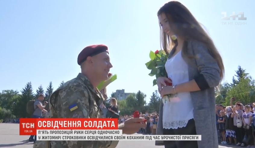 У Житомирі під час урочистої військової присяги своїм дівчатам освідчились одразу п’ятеро бійців-строковиків.