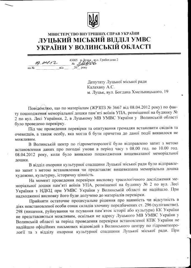 Про це йдеться у відповіді, яку депутату міської ради Андрію Калахану надав начальник міськвідділу УМВС України у Волинській області Роман Крохмаль. Текст відповіді депутат оприлюднив 14 травня у соціальній мережі Facebook.