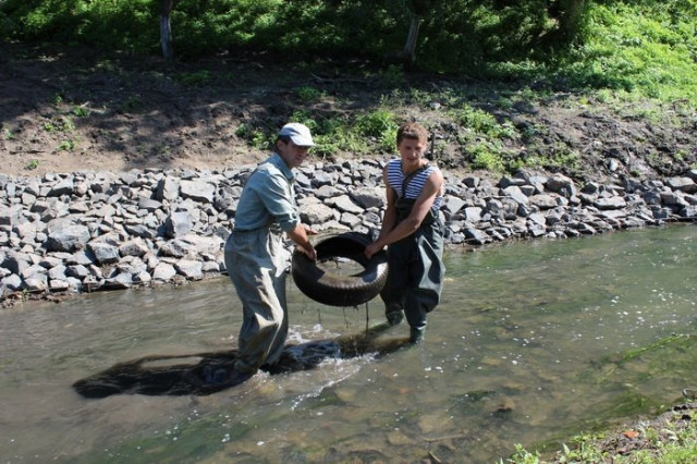Робітники розчищають русло річки, з якого виймають на беріг різний мотлох. Зокрема, це й автомобільні шини, пляшки, цегла, дошки, поліетиленові кульки тощо.