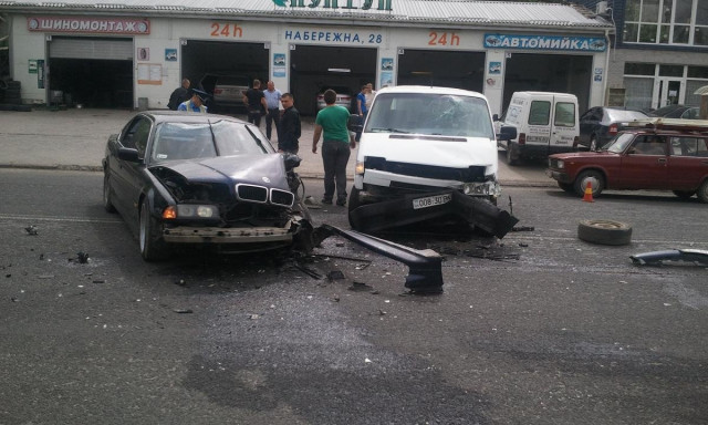 На фото видно: зіткнулися автомобіль марки BMW та Volkswagen Transporter.