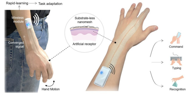 Зазначається, що науковці розпорошили електрично-чутливу рідину на шкіру, щоб автоматично надрукувати електрично чутливу нанометрову сітку, що тягнеться від передпліччя до зворотної сторони долоні.Сітка викликала електричні сигнали, коли рух руки змушував сітку розтягуватися або стискатися. Ці електричні сигнали приймав модуль Bluetooth, який кріпився на кінцівці сітки на передпліччі.