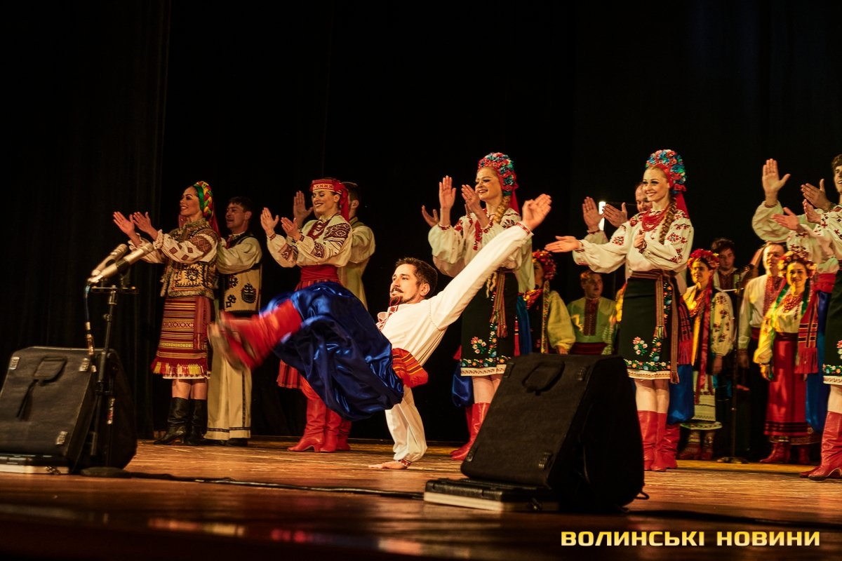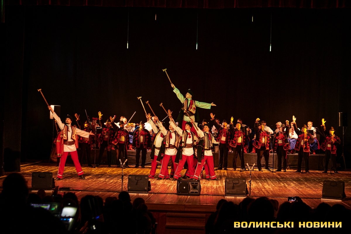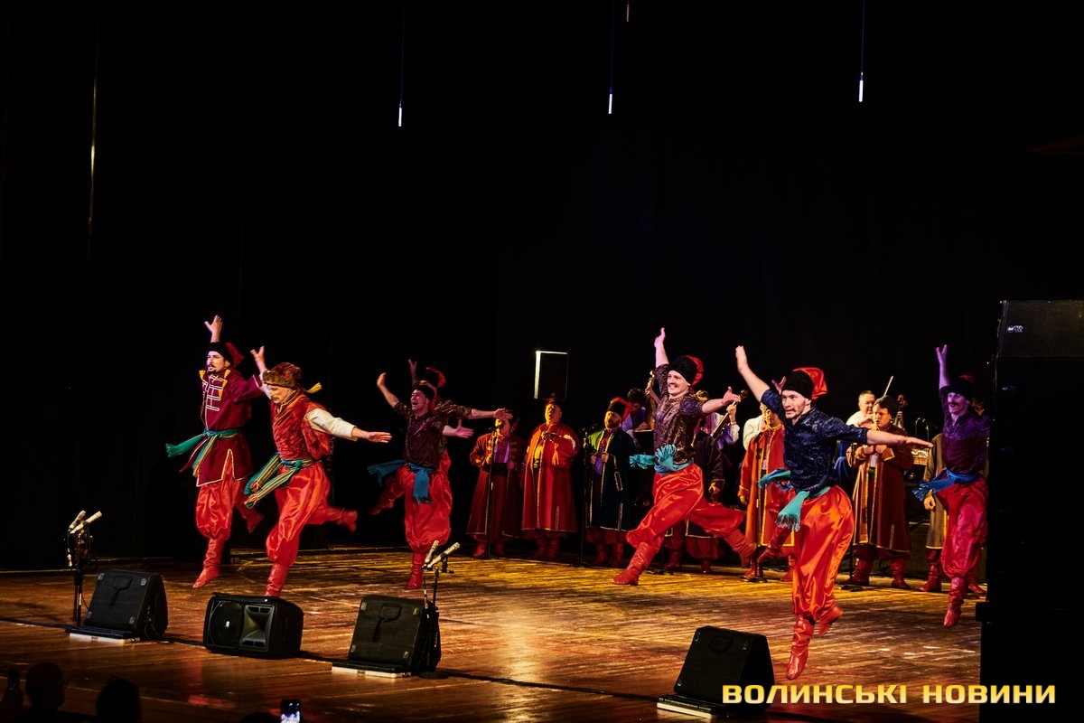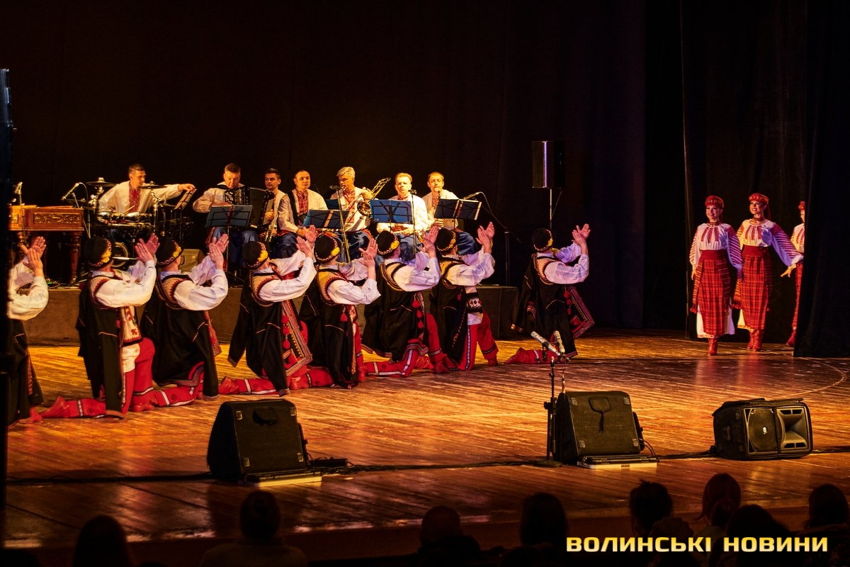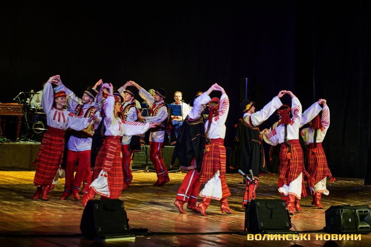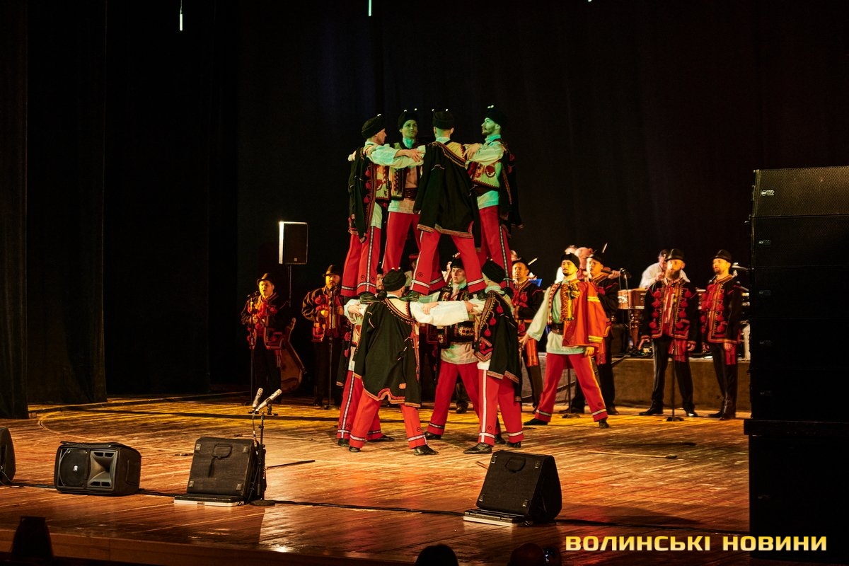 Концерт розпочався з хвилини пам’яті за тими, хто віддав свої життя за Україну. Козацькі думи, жартівливі сценки, лірика, гаївки та веснянки переплелися у неймовірне видовище.Кілька разів зі сцени лунали композиції, які глядачі зустрічали оплесками та стоячи. Особливо запам’яталися пісні: «Ой у лузі червона калина...», «Реве та стогне Дніпр широкий», жартівлива сценка «Козацькі забави» та звичайно карпатський аркан.«Дякуємо Волинській землі за гостинний прийом. Тут надзвичайна атмосфера і талановиті люди. Безмежно дякуємо нашим воїнам за те, що ми сьогодні усі разом співаємо, танцюємо і можемо так спілкуватися. Слава Збройним силам України! Ми збираємо цей тиждень кошти на карети швидкої допомоги... Українці – одна велика родина. І давайте працювати усі разом на перемогу. Я впевнена, що в цьому залі немає жодної людини, яка була би байдужою до долі нашої держави. Тому що Говерла стоїть, Дніпро реве, Україна бореться. Україна була, Україна є і Україна буде...І нехай згинуть наші вороженьки, як роса на сонці!», – звернулася до глядачів ведуча свята.