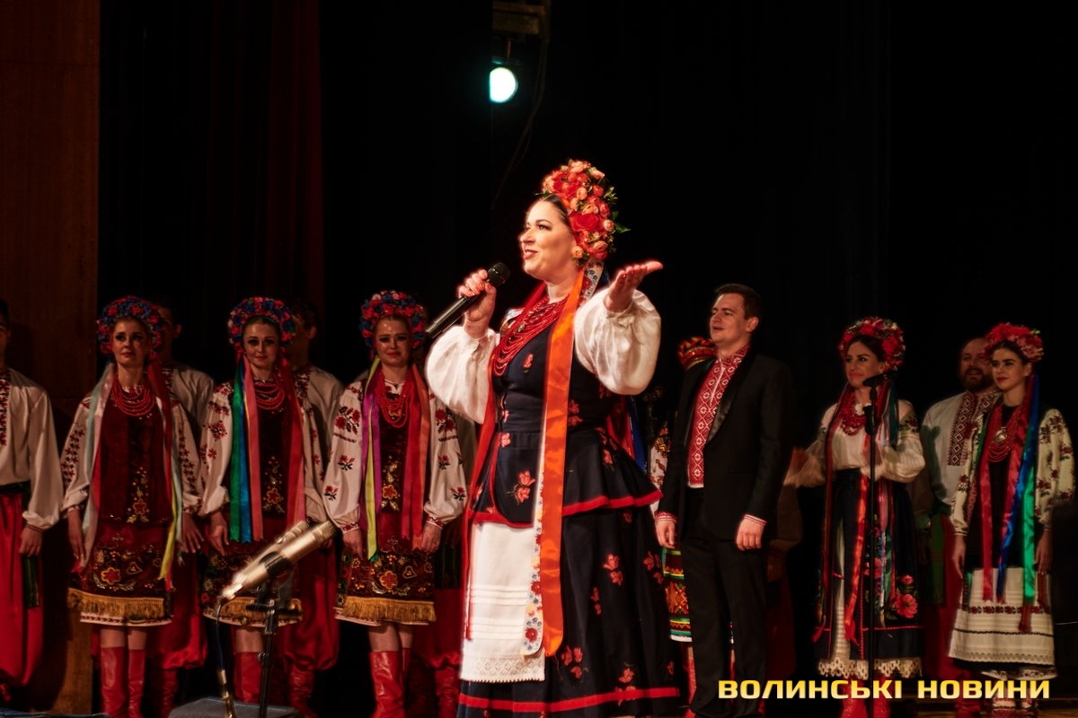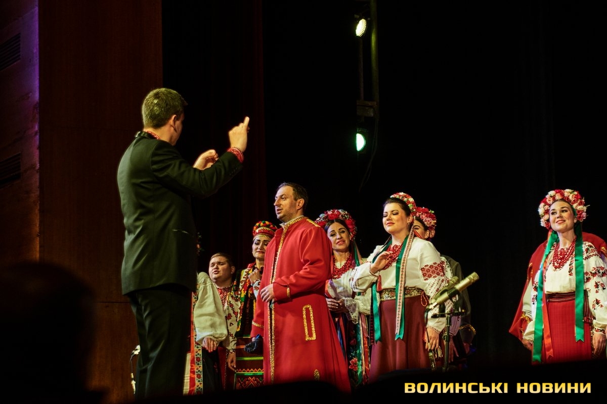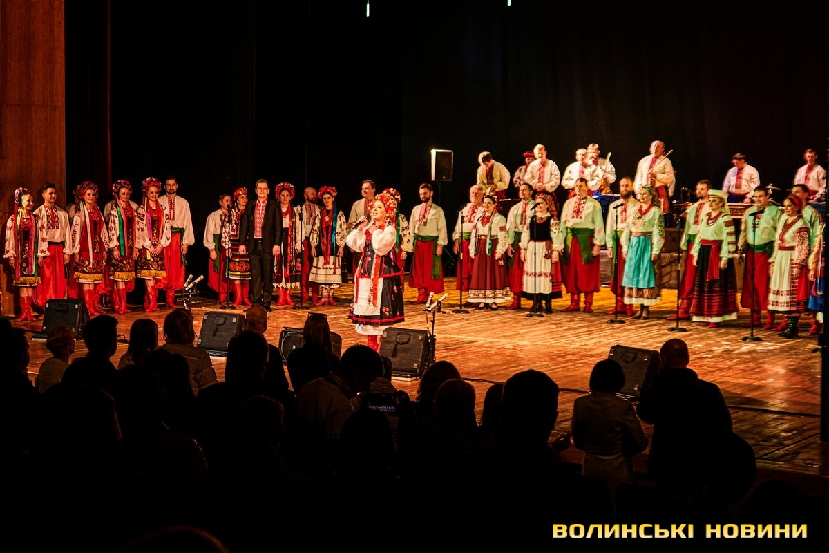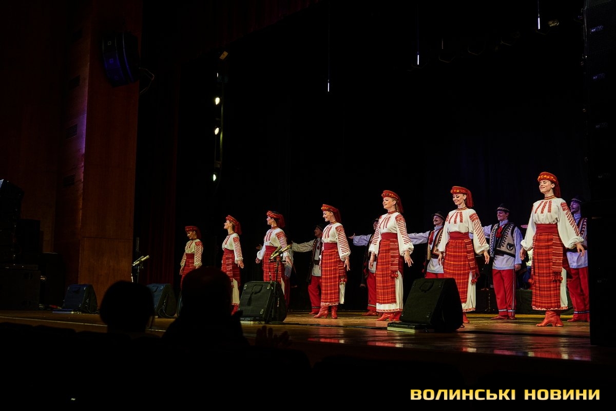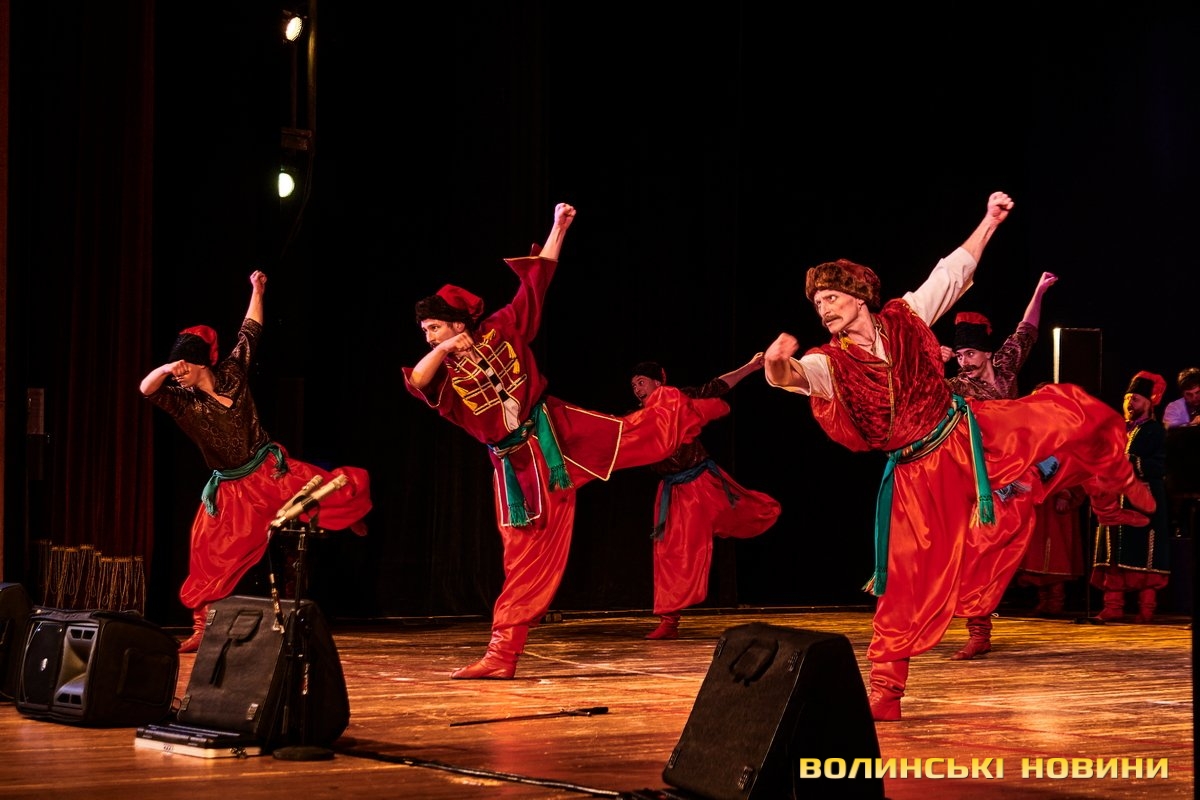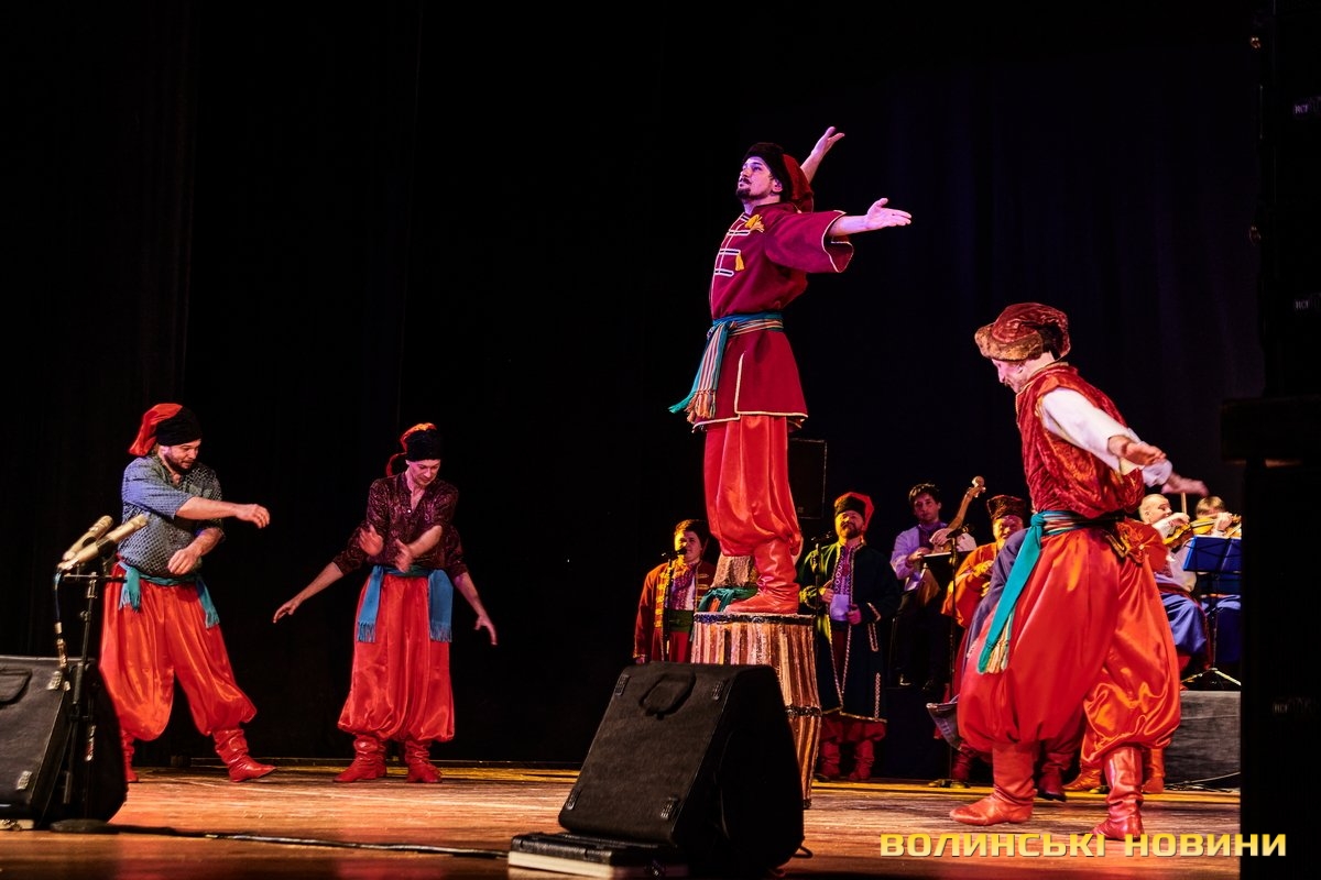 Концерт розпочався з хвилини пам’яті за тими, хто віддав свої життя за Україну. Козацькі думи, жартівливі сценки, лірика, гаївки та веснянки переплелися у неймовірне видовище.Кілька разів зі сцени лунали композиції, які глядачі зустрічали оплесками та стоячи. Особливо запам’яталися пісні: «Ой у лузі червона калина...», «Реве та стогне Дніпр широкий», жартівлива сценка «Козацькі забави» та звичайно карпатський аркан.«Дякуємо Волинській землі за гостинний прийом. Тут надзвичайна атмосфера і талановиті люди. Безмежно дякуємо нашим воїнам за те, що ми сьогодні усі разом співаємо, танцюємо і можемо так спілкуватися. Слава Збройним силам України! Ми збираємо цей тиждень кошти на карети швидкої допомоги... Українці – одна велика родина. І давайте працювати усі разом на перемогу. Я впевнена, що в цьому залі немає жодної людини, яка була би байдужою до долі нашої держави. Тому що Говерла стоїть, Дніпро реве, Україна бореться. Україна була, Україна є і Україна буде...І нехай згинуть наші вороженьки, як роса на сонці!», – звернулася до глядачів ведуча свята.