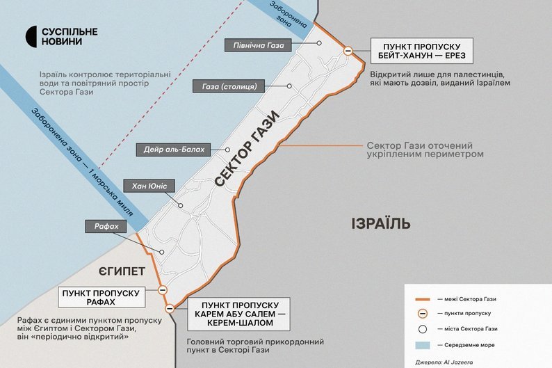 Представниця Міжнародного комітету Червоного Хреста у Палестині Сара Девіс заявила Суспільному, що не має «жодної перевіреної інформації» щодо того, чи можуть люди евакуюватися з Гази через Єгипет.Ізраїль контролює повітряний простір над Сектором Гази та його береговою лінією, а також ввезення і вивезення товарів через свої прикордонні пункти. Напередодні країна заявила, що перекриває туди постачання їжі, газу та електроенергії. У Газі живе понад 2 мільйони людей, більшість з них – залежить від гуманітарної допомоги.