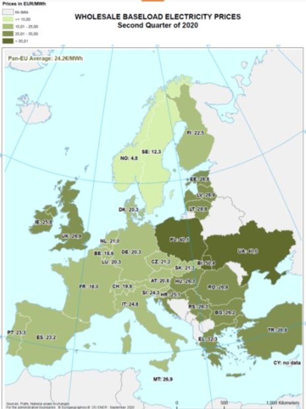 Згідно зі звітом, у другому кварталі високі ціни на електроенергію в Європі спостерігалися в торговельній зоні Бурштинський енергоострів (БУОС, 50,4 євро/МВт-год), у польській енергетичній системі (40,1 євро/МВт-год) і в Об'єднаній енергетичній системі України (ОЕС, 40 євро/МВт-год).