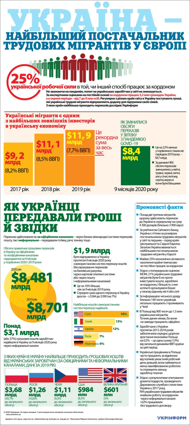 Незважаючи на пандемію, попит на українських заробітчан у світі не зменшується. За експертними оцінками на постійній основі за кордоном працює 3,2 млн громадян України, а в окремі періоди – від 7 до 9 млн осіб. Регулярно з різних країн світу в Україну поступають гроші, які українські трудові мігранти відправляють додому для підтримки своїх сімей.