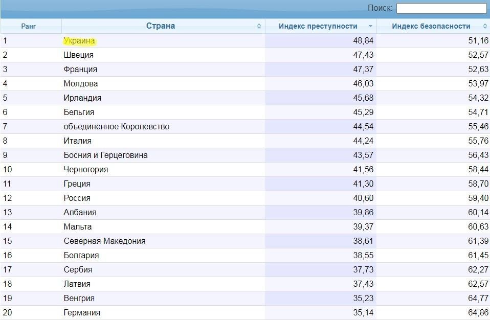 Аналітики прорахували індекс злочинності в різних державах. Серед країн Європи Україна перша з показником 48,84. Також у трійці перших Швеція (47,43) і Франція (47,37).