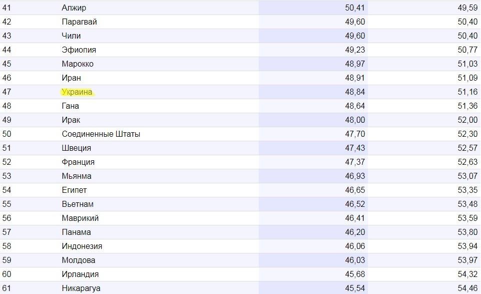 Далі йдуть Молдова, Ірландія, Бельгія, Сполучене Королівство, Італія, Боснія і Герцеговина, Чорногорія.За даними фахівців Numbeo, серед країн світу Україна посіла 47 місце. Перед Україною в світовому списку Марокко (48,97) та Іран (48,91). За нашою країною з меншим рівнем злочинності Гана (48,64), Ірак (48,00).