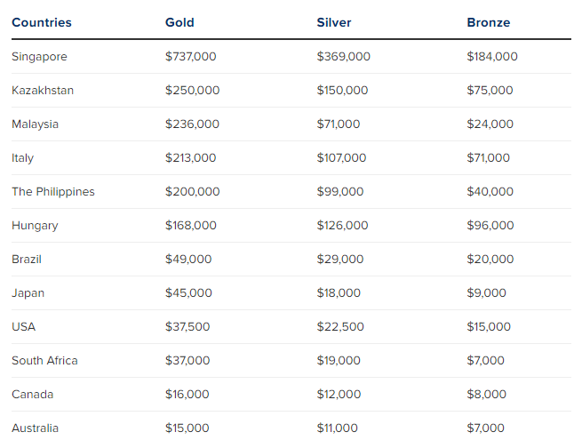 1. Сінгапур – 738 тисяч доларів за золото, 500 тисяч за срібло, 250 тисяч за бронзу;