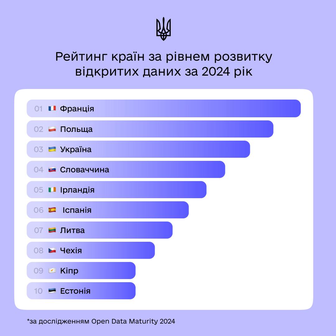 «Цьогоріч рівень зрілості відкритих даних в Україні становить 97%, коли середній показник у Європі – 83%. А з 2020 року ми піднялися в рейтингу з 17-го місця на третє – це результат постійної роботи нашої команди», – йдеться в повідомленні.